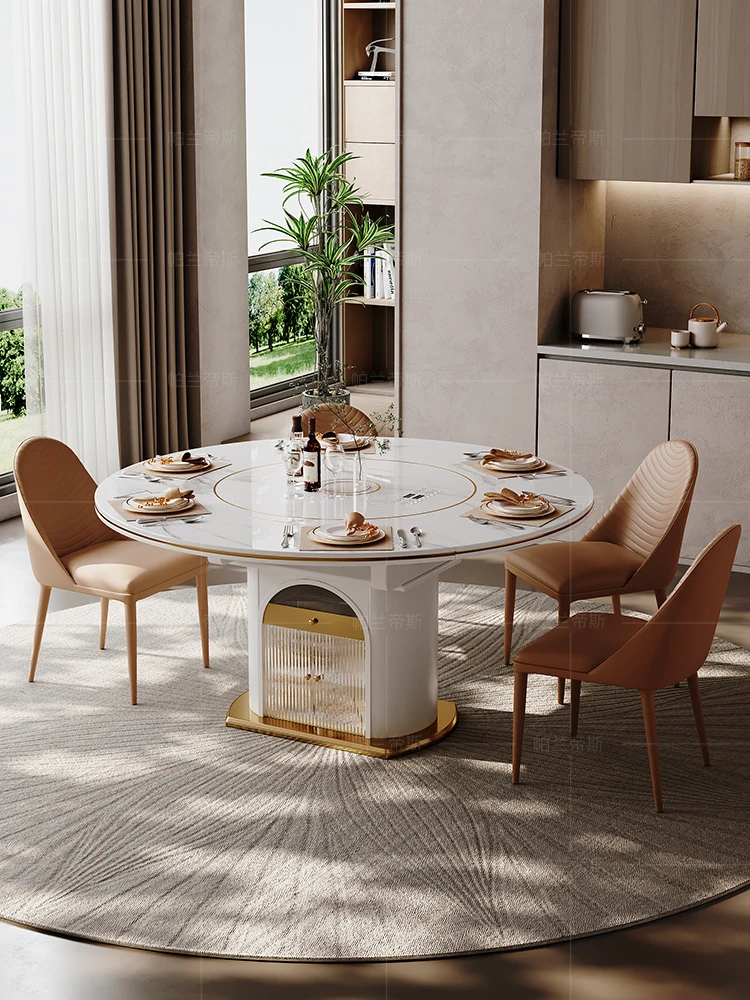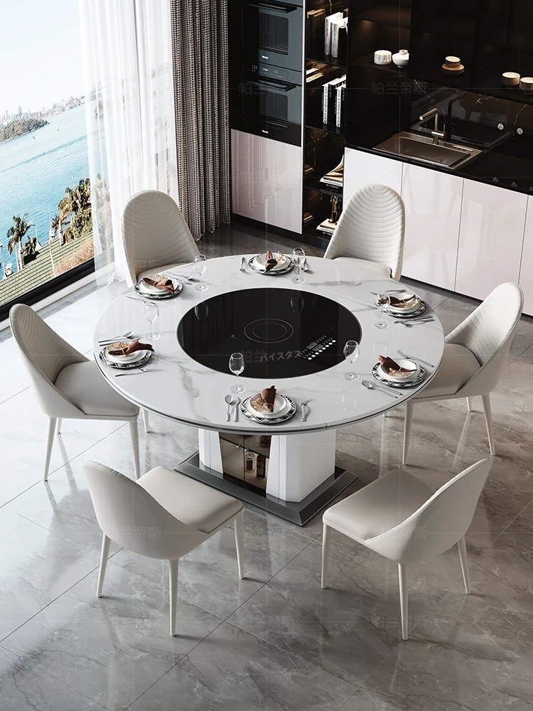 国補岩板多機能ダイニングテーブル - 電磁調理器&温蔵板付き、伸縮可能な現代的な円形デザイン!おしゃれな家用テーブルで、家族の団らんやおもてなしに最適!