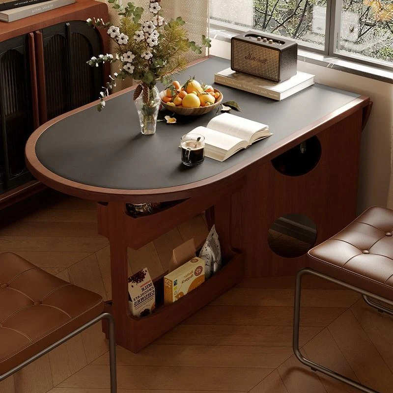 レトロな壁付けの岩板ダイニングテーブル、北欧モダンでシンプルなデザイン。小スペース向けの折りたたみ式楕円テーブル、使い勝手抜群でおしゃれな食卓を実現!