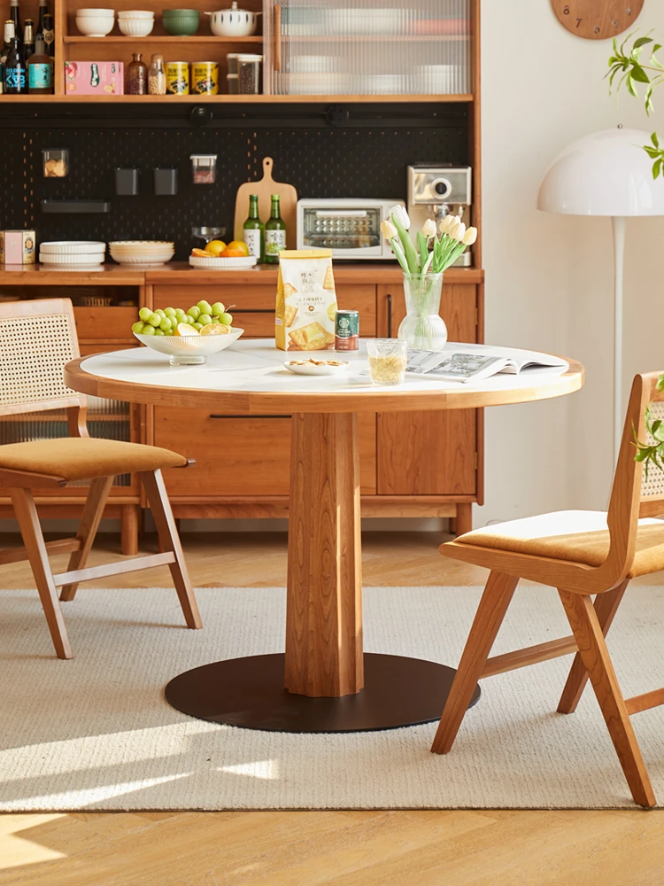 北欧スタイルの無垢材サークルテーブル - ヴィンテージ感漂う岩板デザイン!小さな家にもぴったりなチェリーウッドの丸型ダイニングテーブル&チェアセット。おしゃれで機能的なリビング・ダイニング空間を演出!