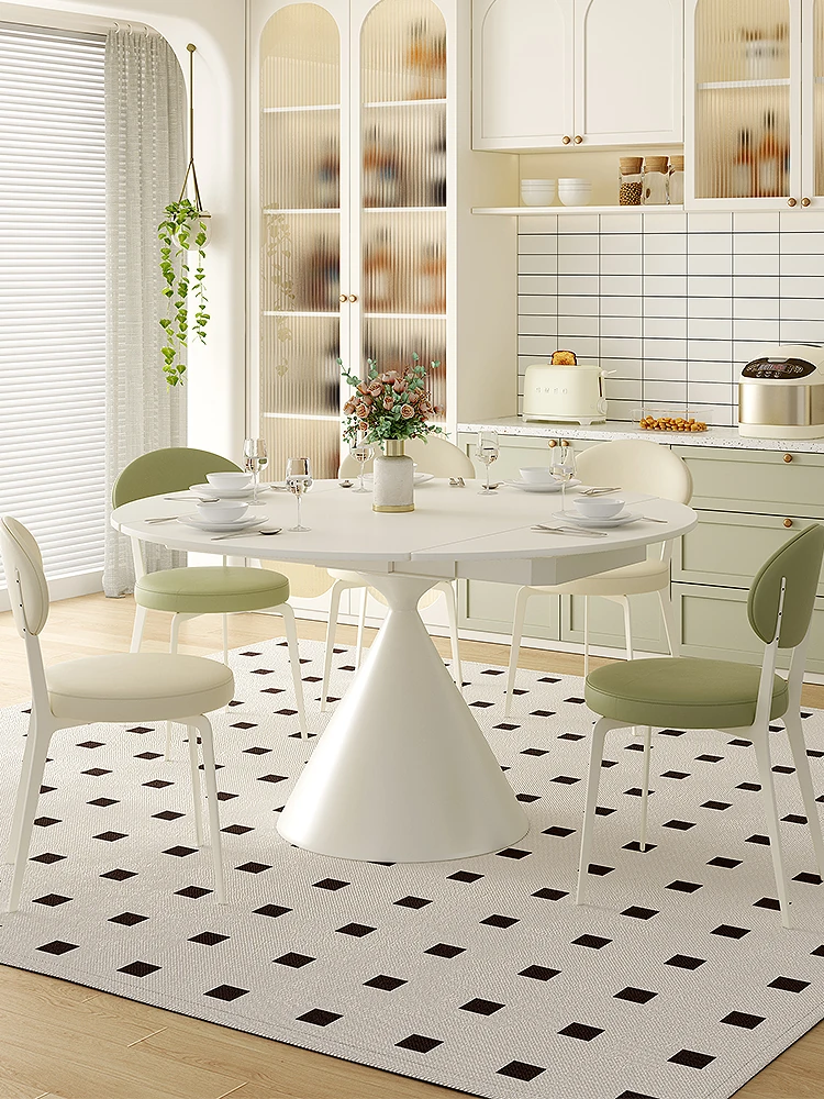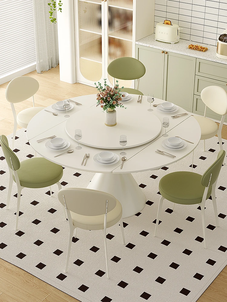 クリーム風の光沢岩板ダイニングテーブル、シンプルでラグジュアリーなデザイン、伸縮可能で小型住宅に最適!回転式の二用途丸テーブルで、家族や友人との楽しい時間を演出します。