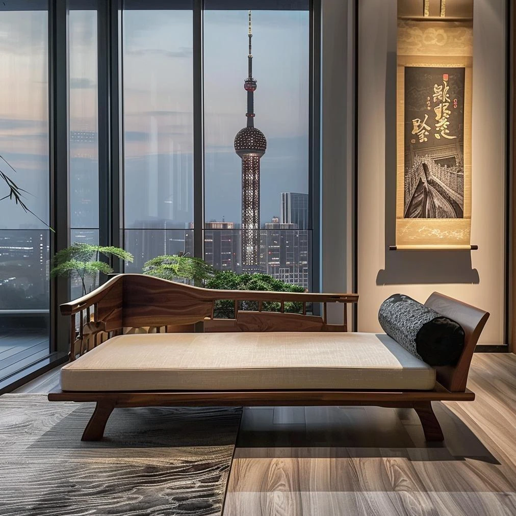 北米産ブラックウォールナットとホワイトアッシュの新中式ソファベッド!贅沢なリラックス空間を提供するデザイン。オフィスやホテル、民宿にも最適な高級感あふれる貴妃椅子。リビングルームにぴったりの魅力的な家具!