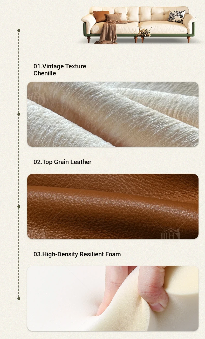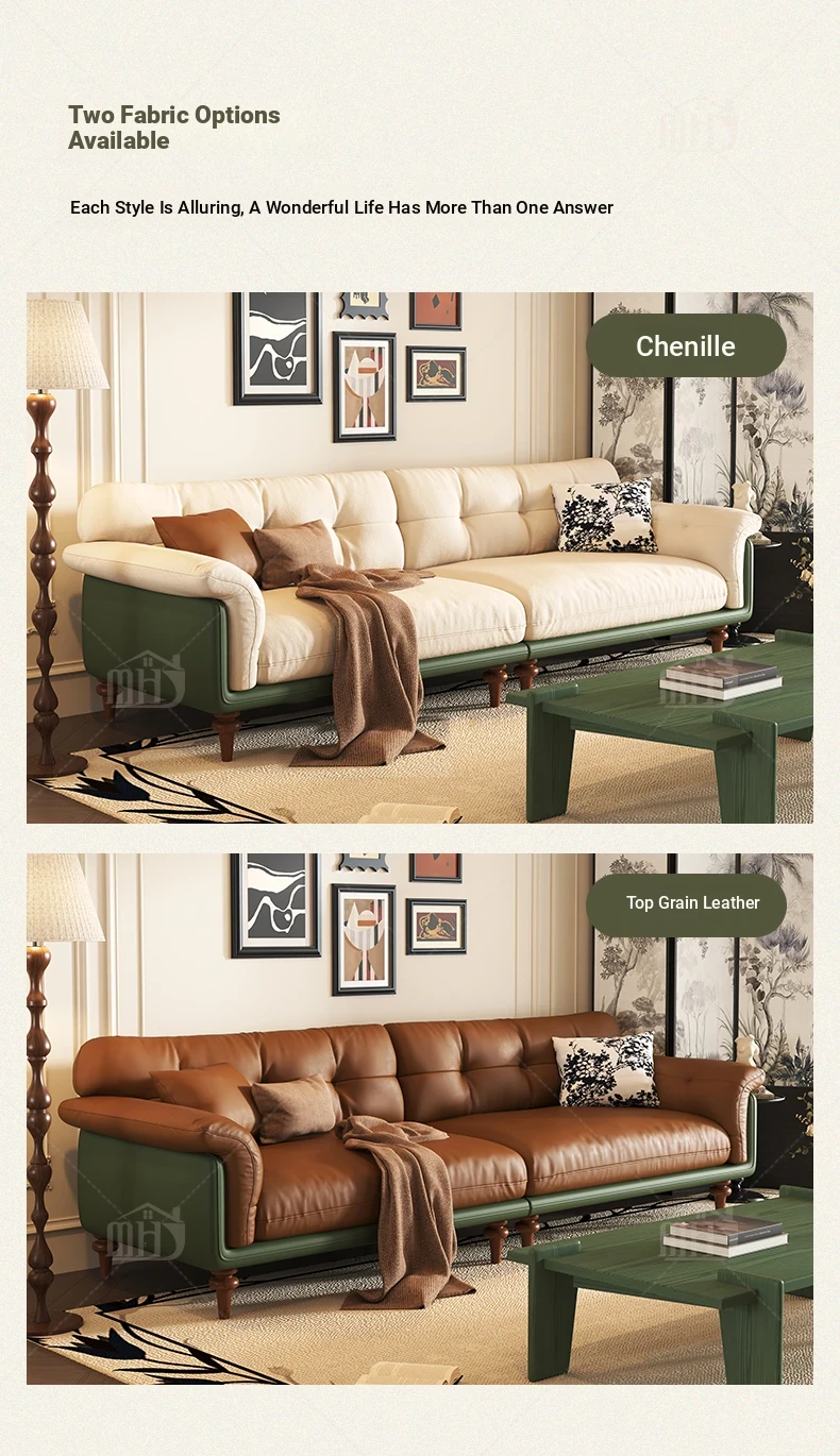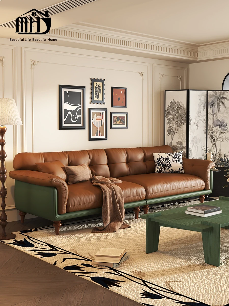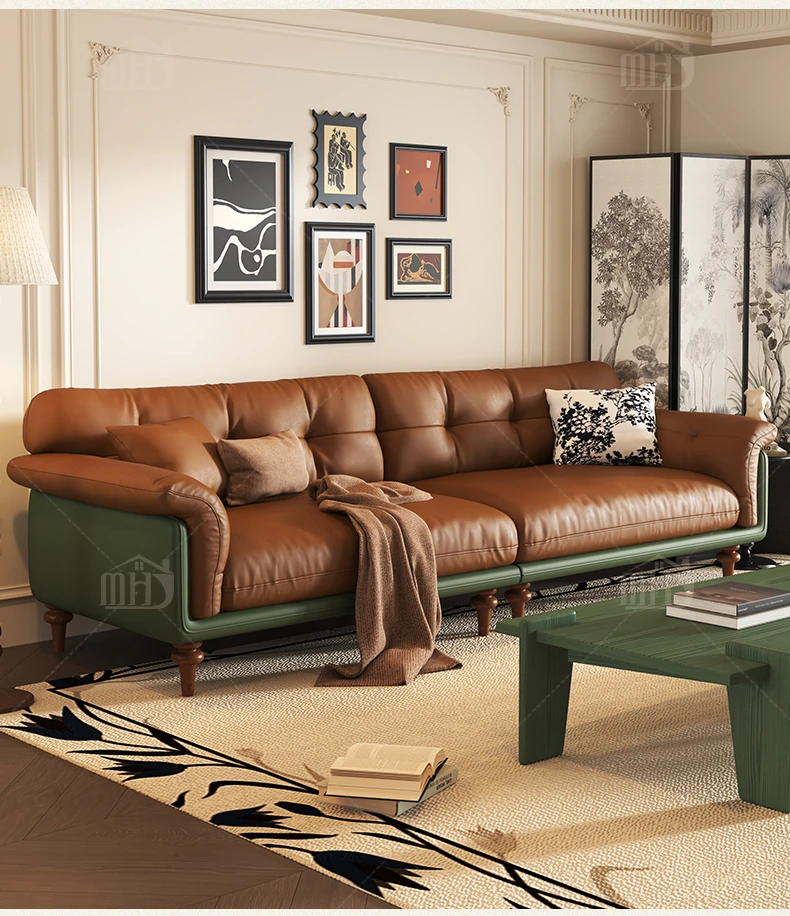 MHJ French Style Genuine Leather Sofa - Vintage American 3-Seater, Removable and Washable Fabric, Perfect for a Classic Home Aesthetic