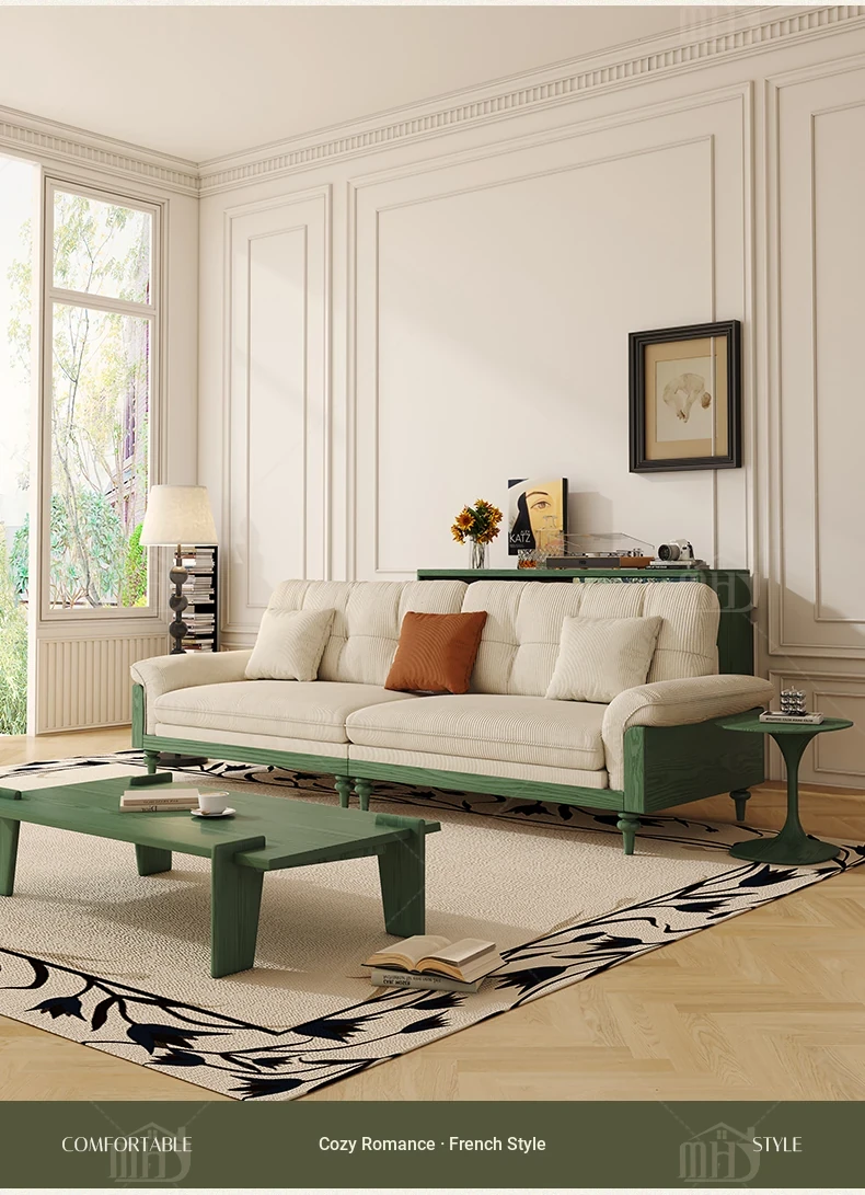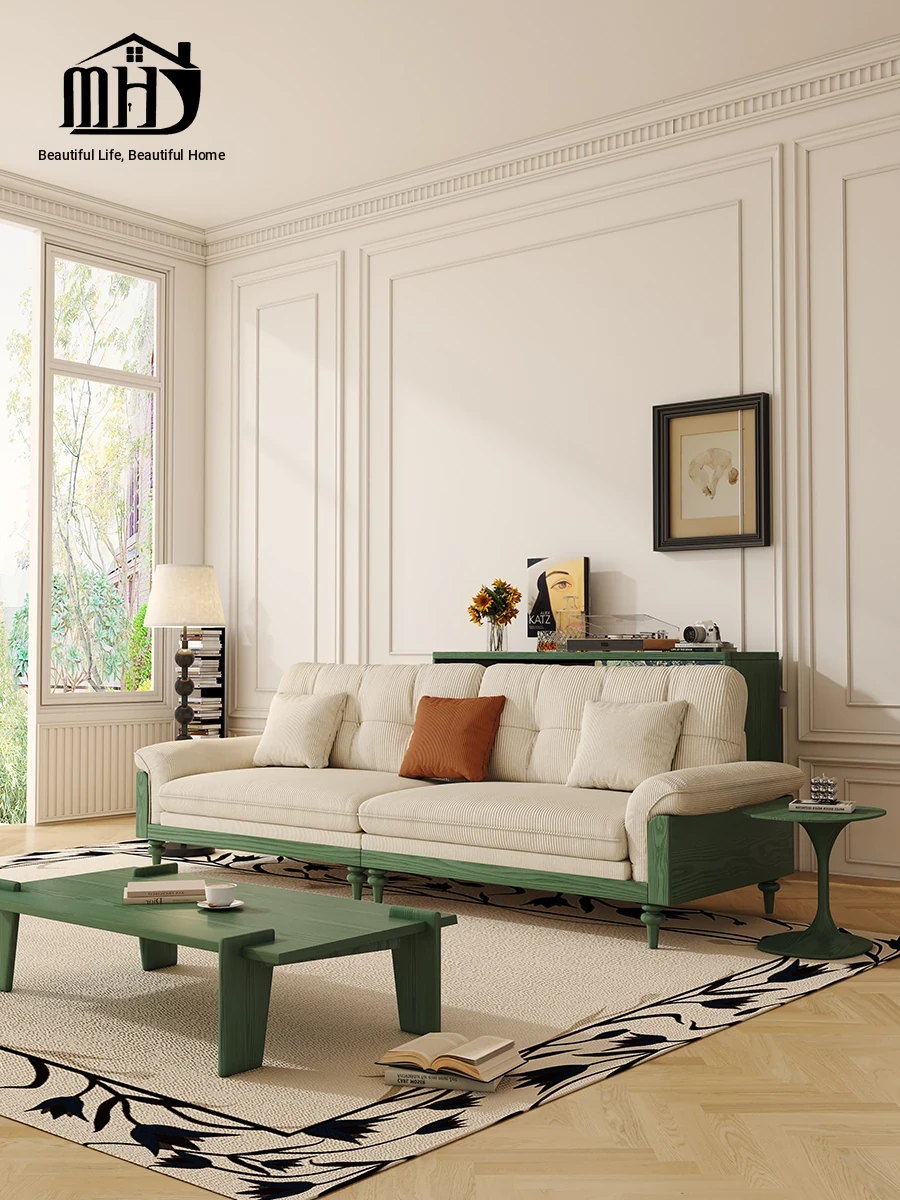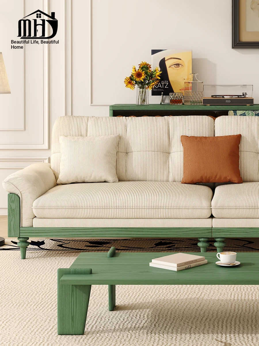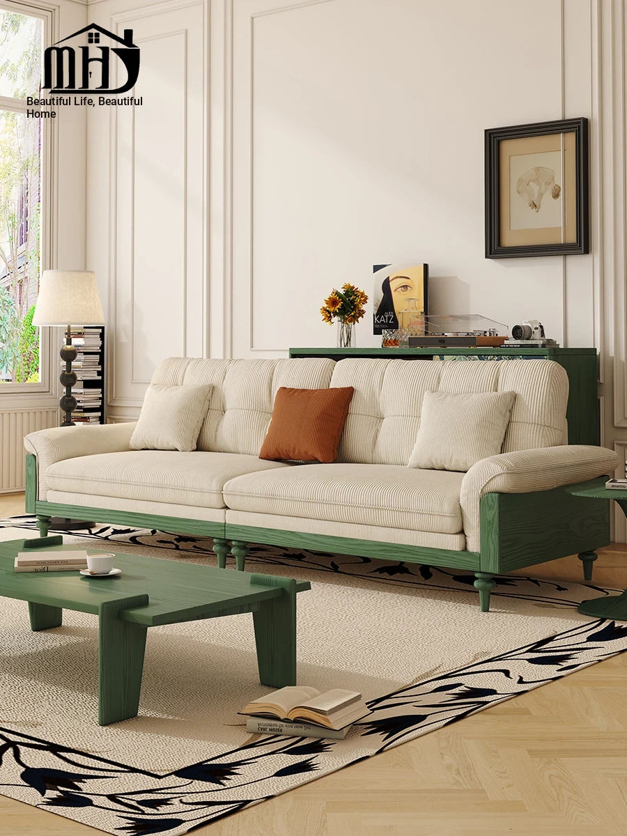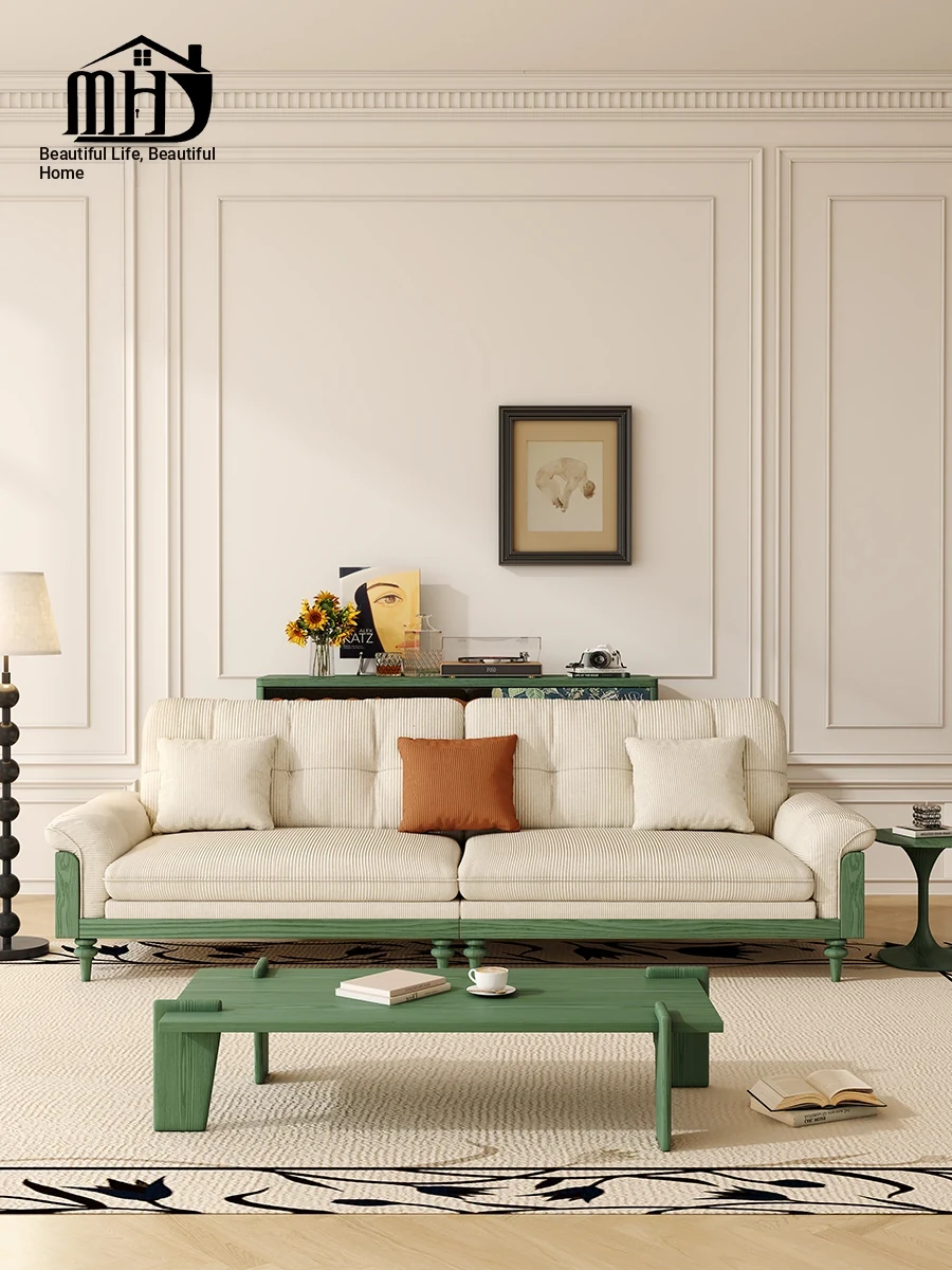 MHJ French Vintage Solid Wood Sofa - Retro Fabric Three-Seat Combination for Small Spaces, American Cloud Style