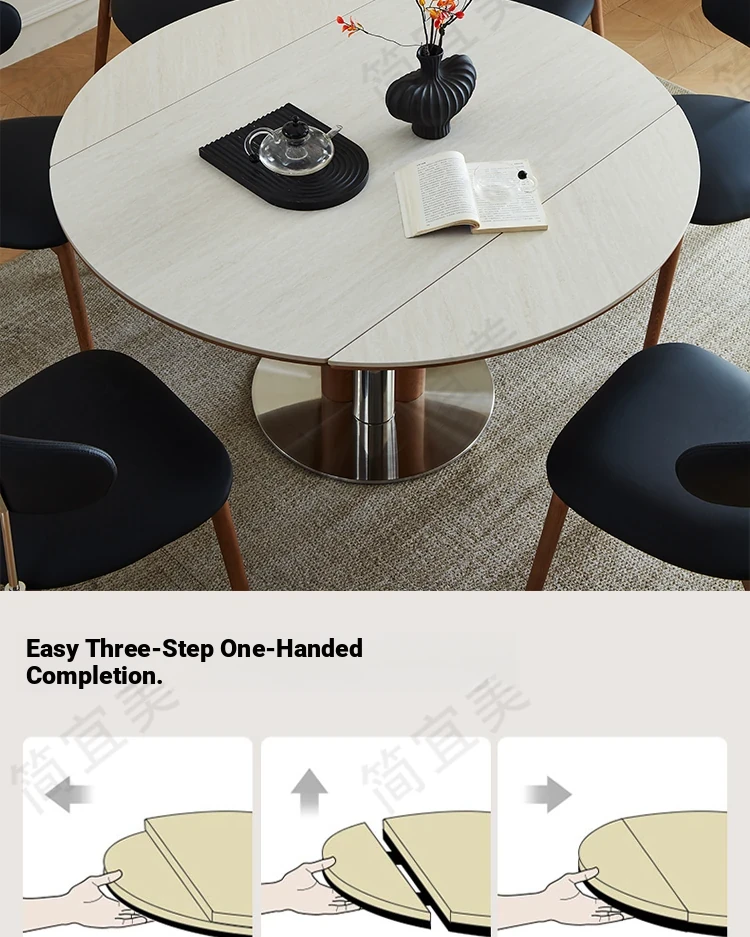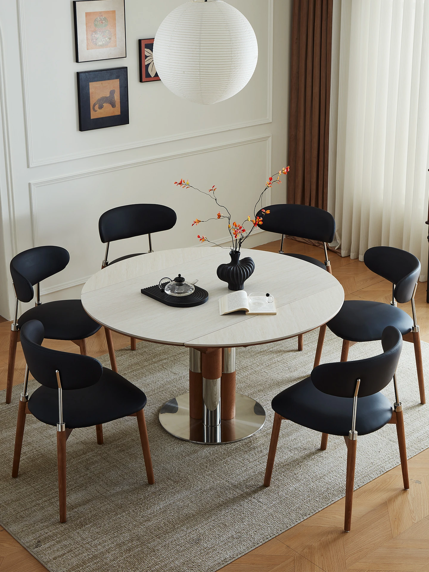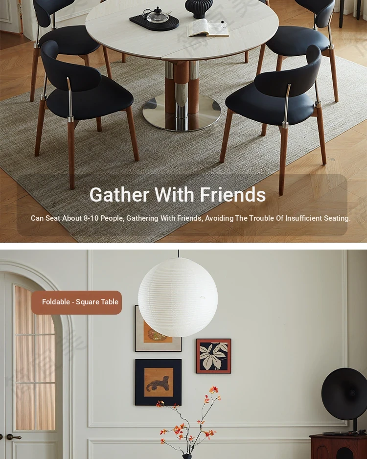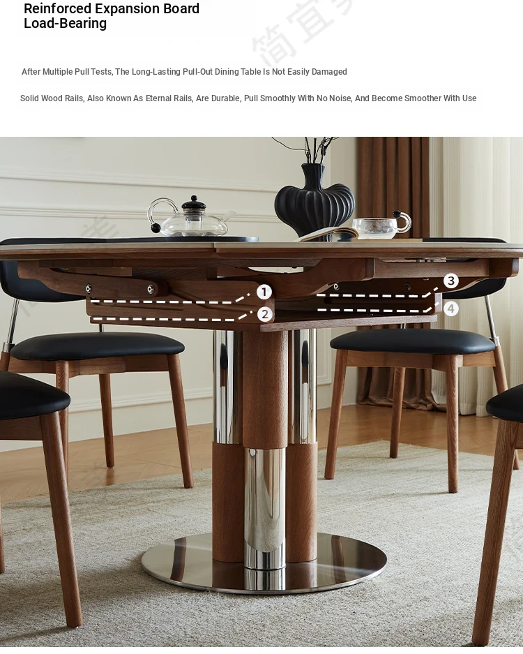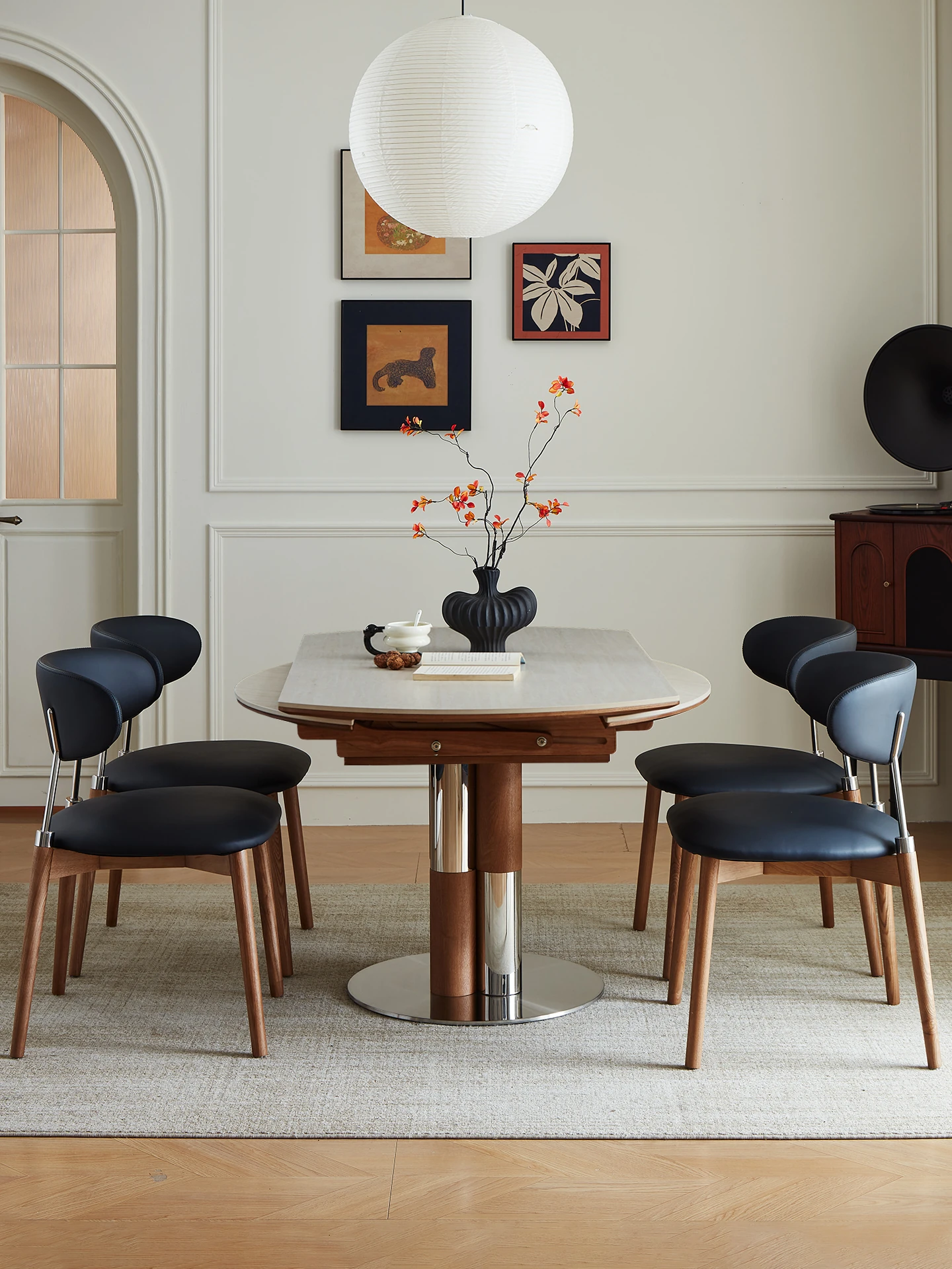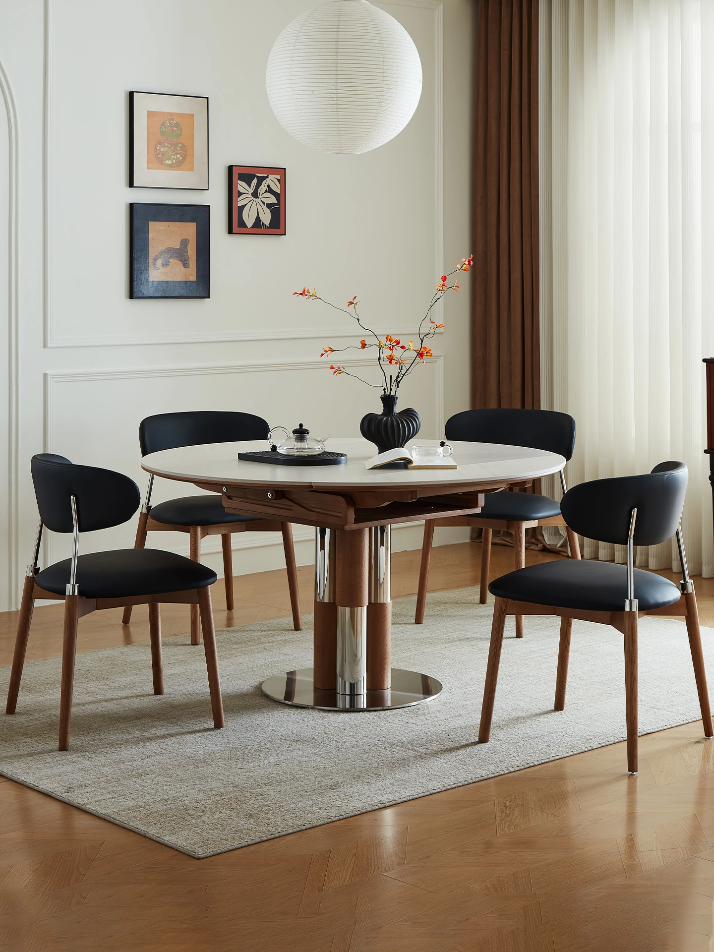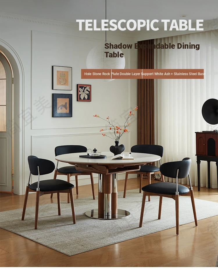 Expandable Round Dining Table and Chair Set with Natural Stone Surface – Bauhaus Vintage Style Solid Wood, Versatile for Home Use as Square or Round Dining Table.