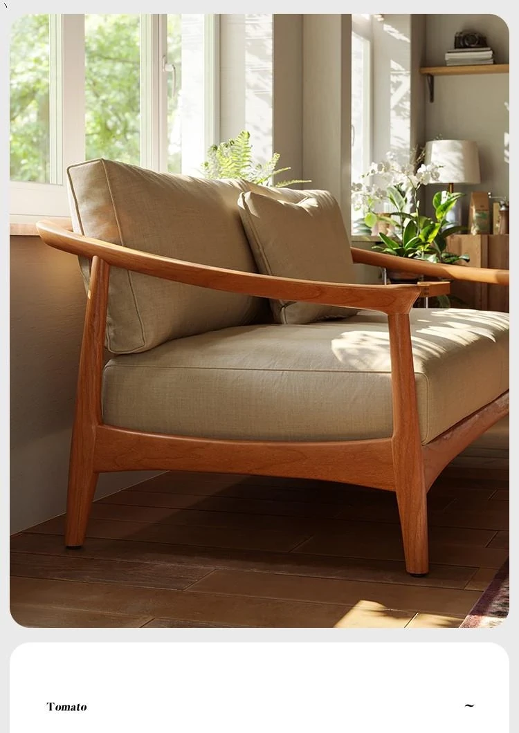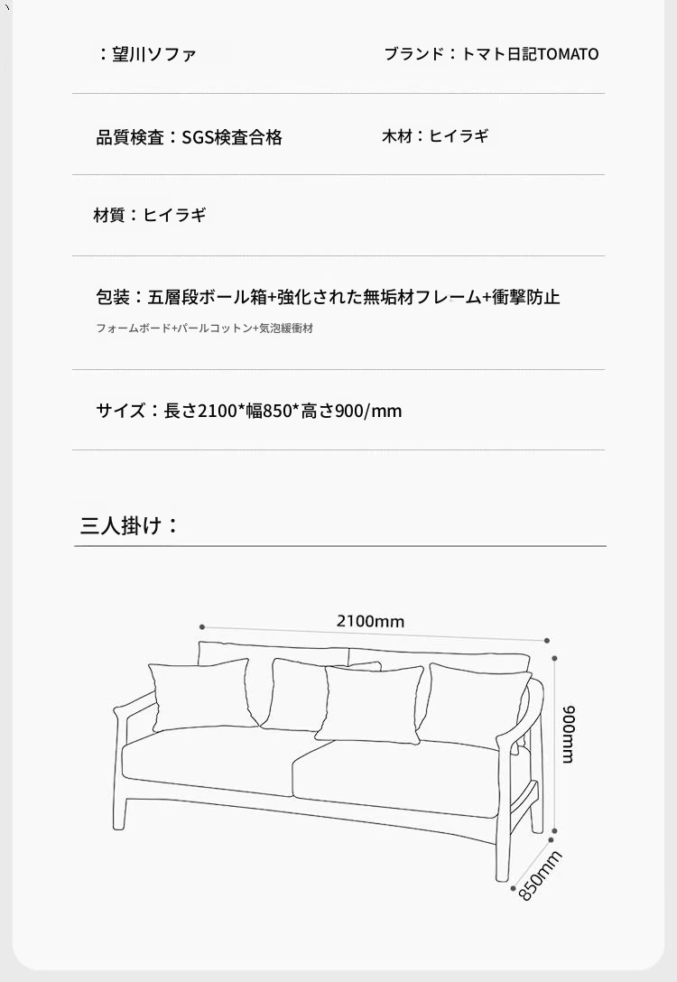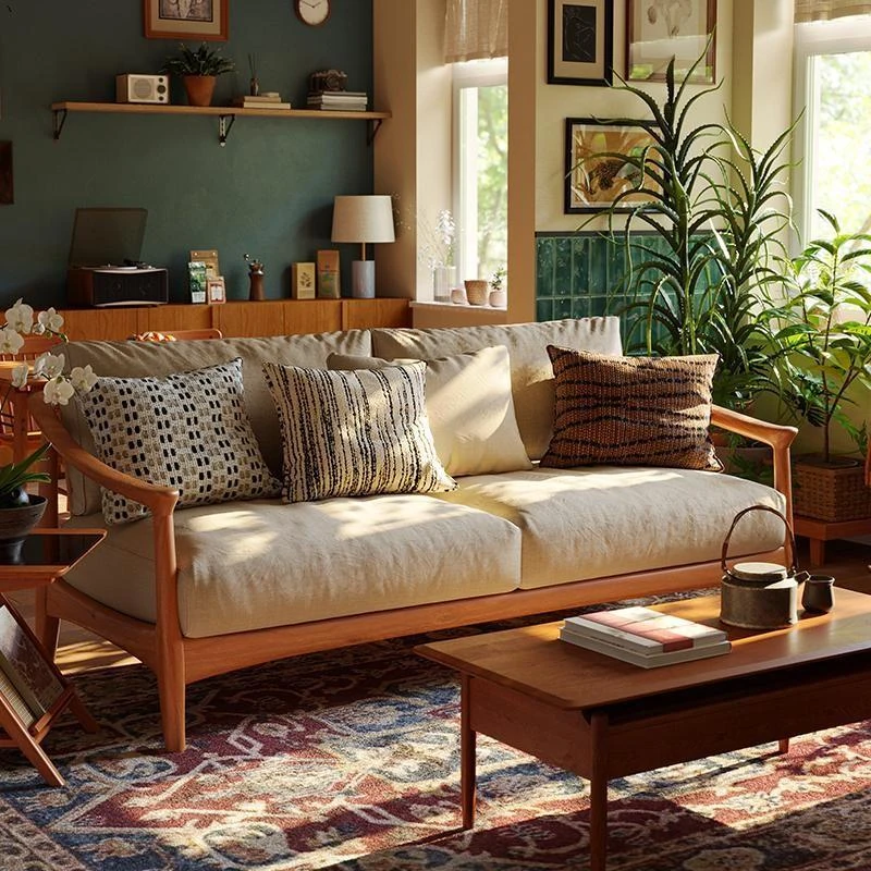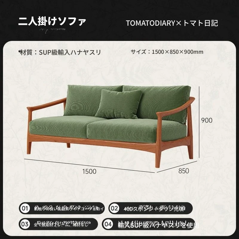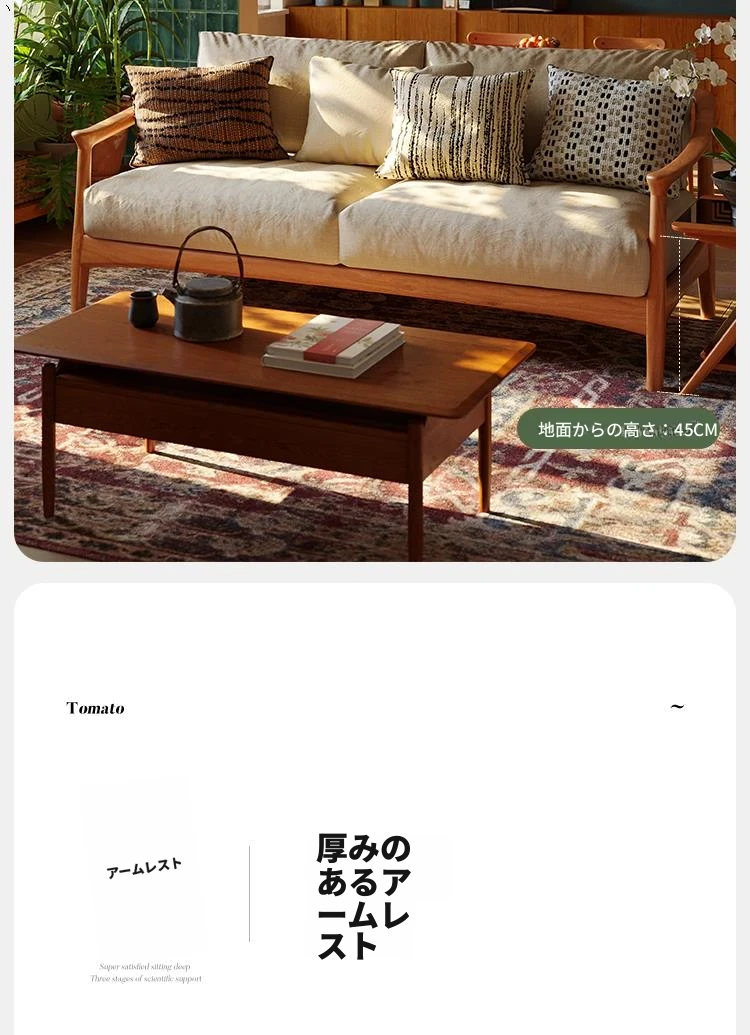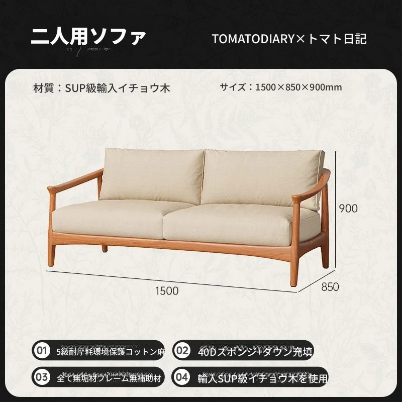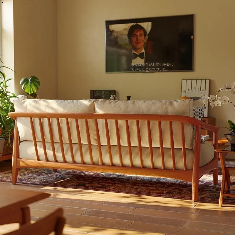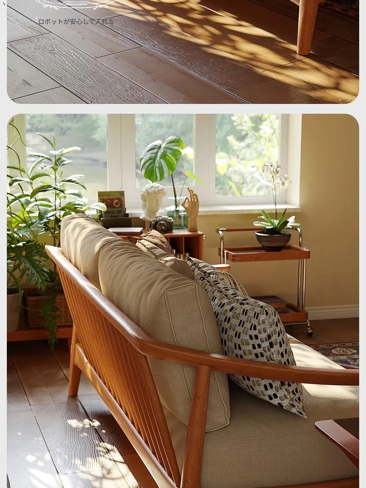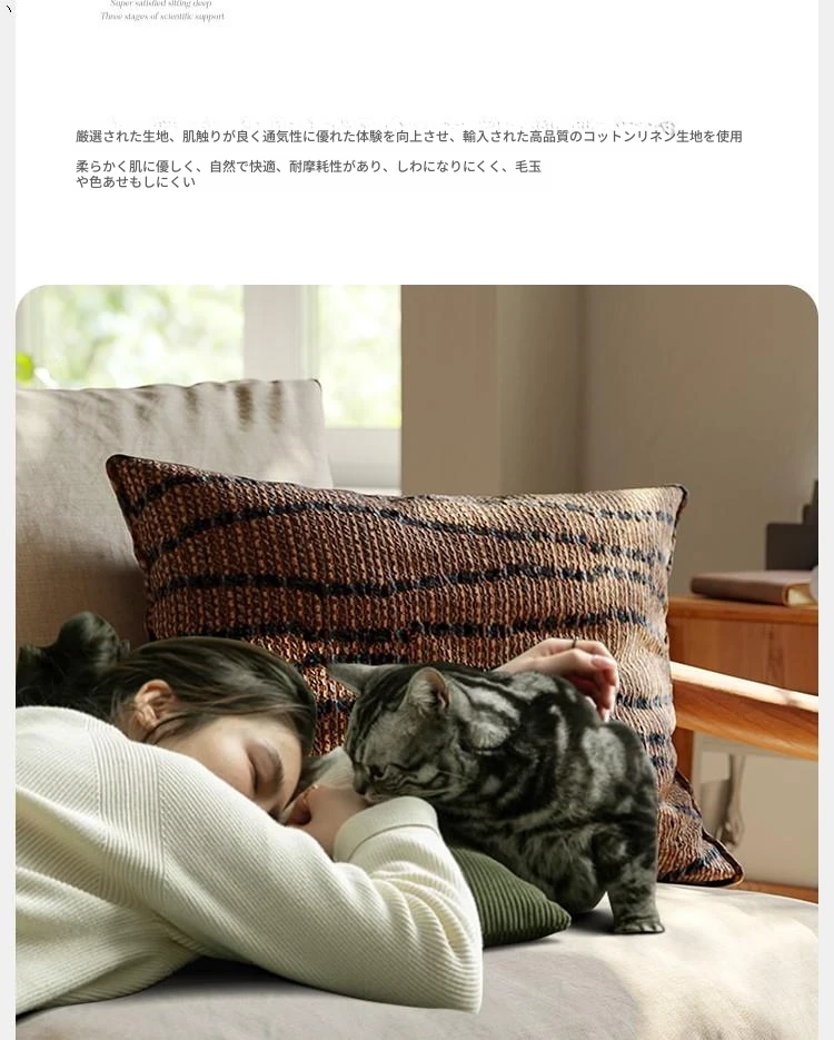 和風シンプルな天然木製ソファ|小型リビングに最適!洗えるカバー付き3人掛け、レトロな雰囲気のファブリックソファで心地よい空間を演出。