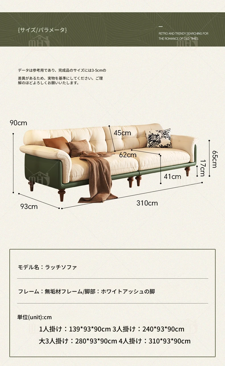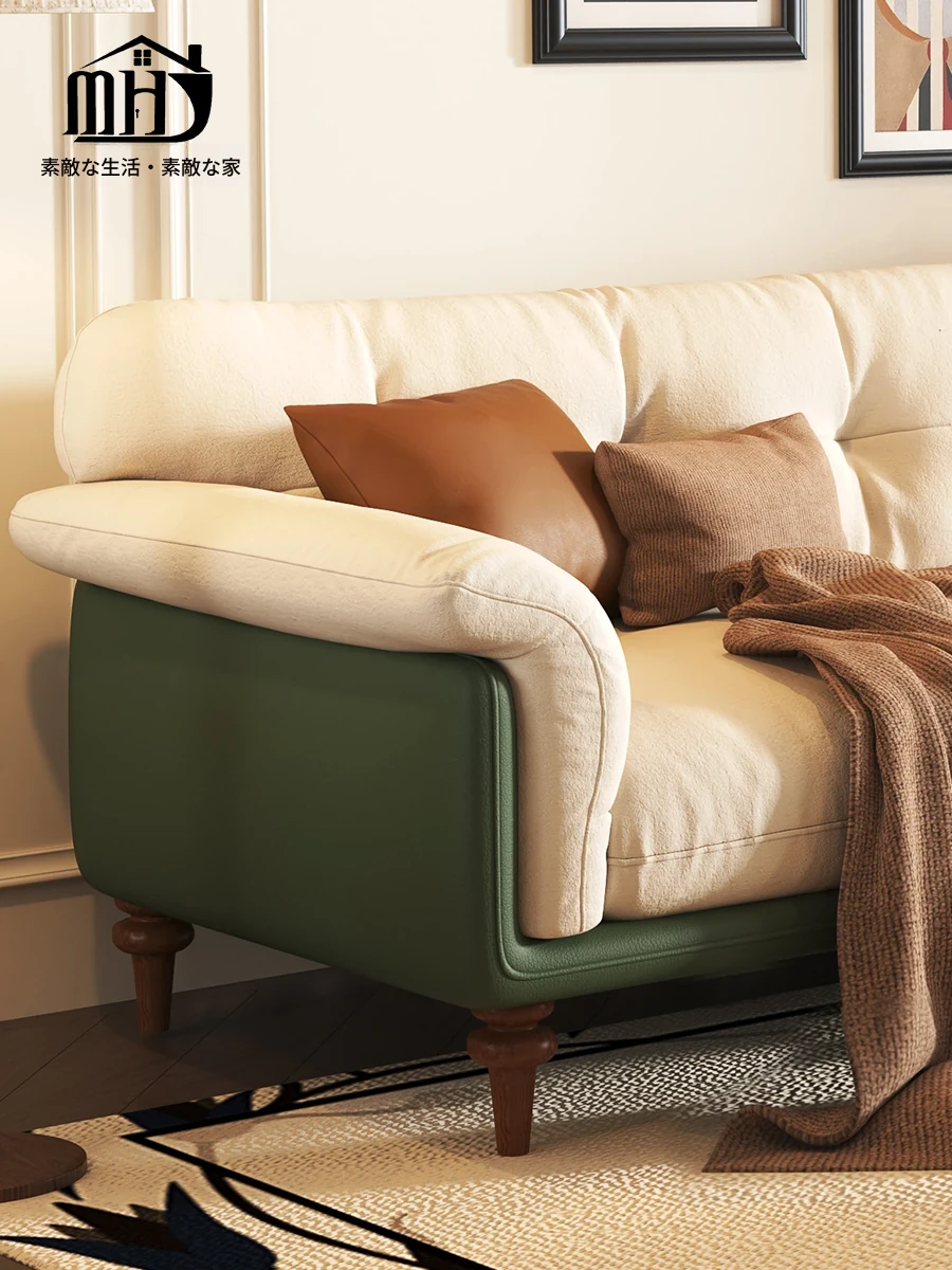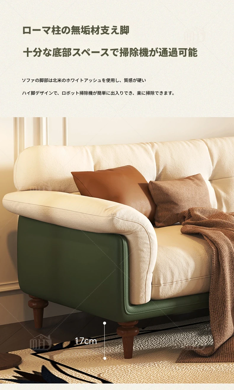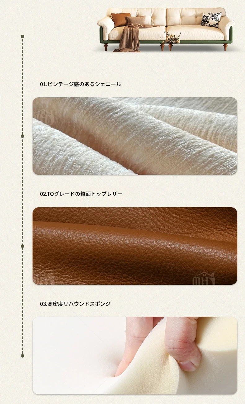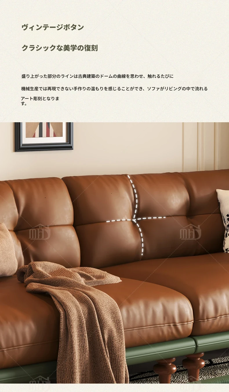 MHJ フランス風レザーソファ 3人掛け アメリカンビンテージスタイル 洗えるレザーと布のコンビネーション 中古風デザインでおしゃれなリビング空間を実現!