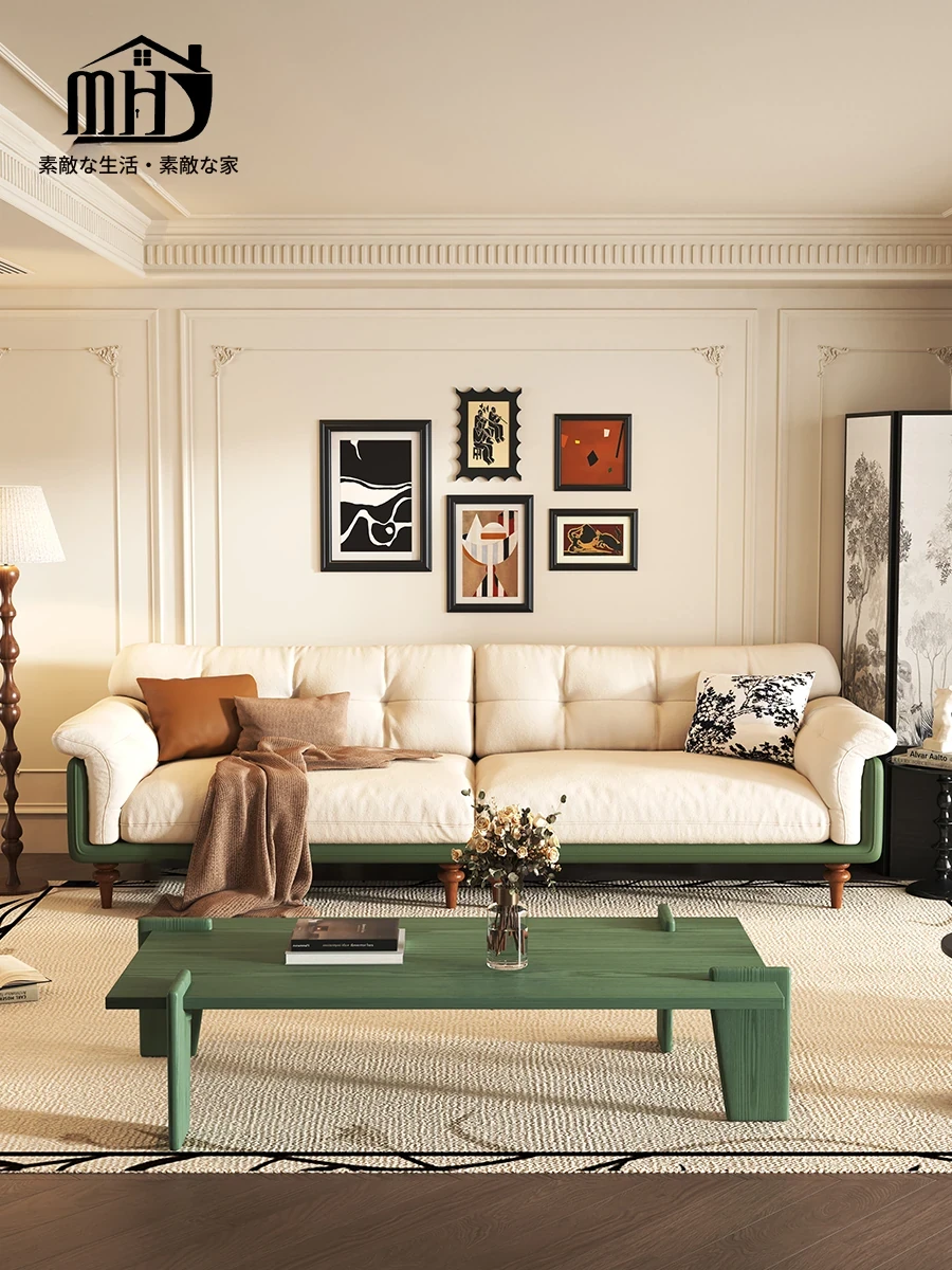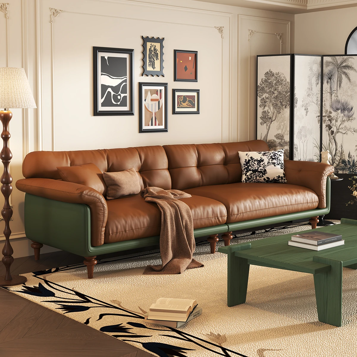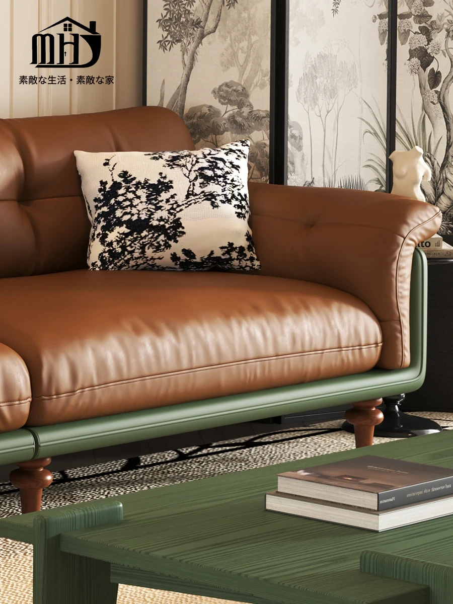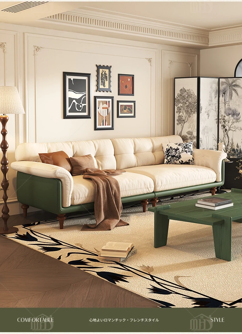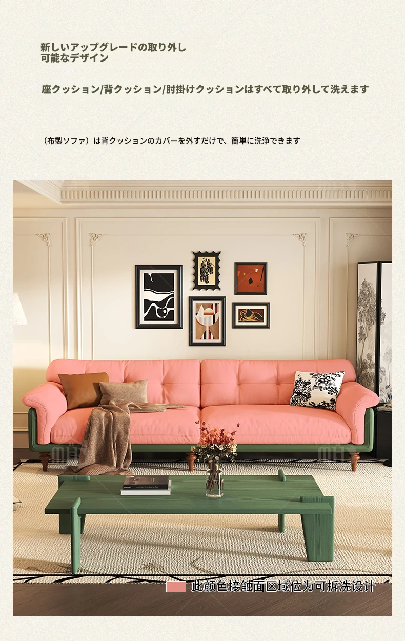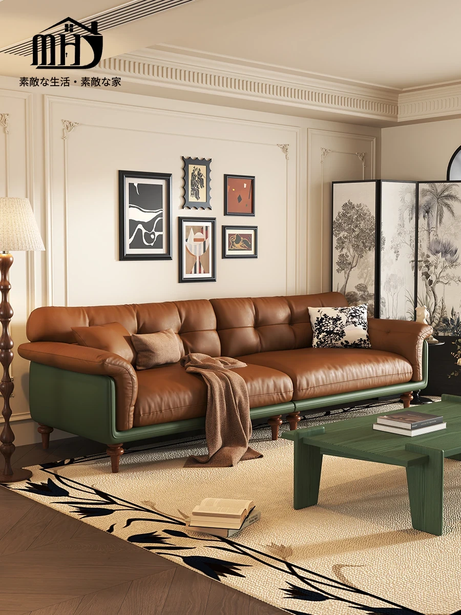 MHJ フランス風レザーソファ 3人掛け アメリカンビンテージスタイル 洗えるレザーと布のコンビネーション 中古風デザインでおしゃれなリビング空間を実現!