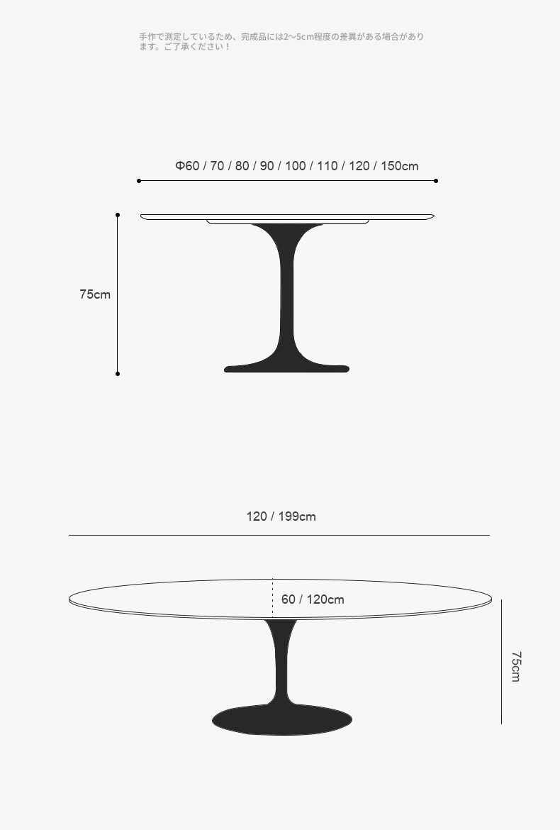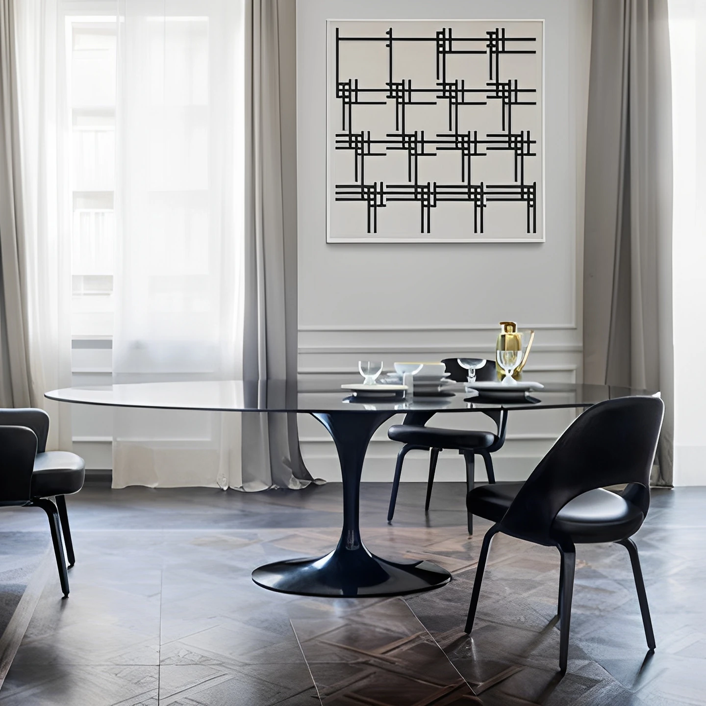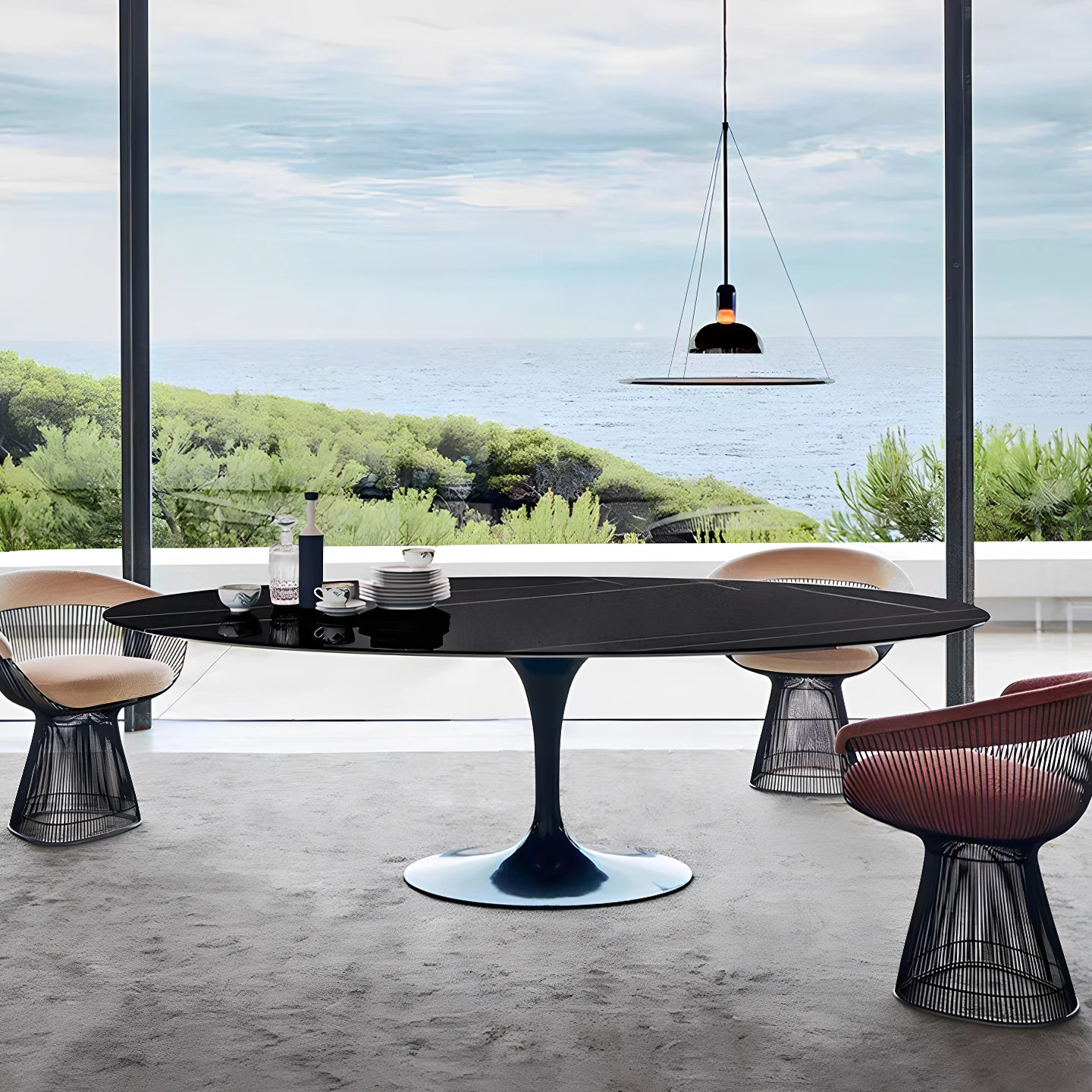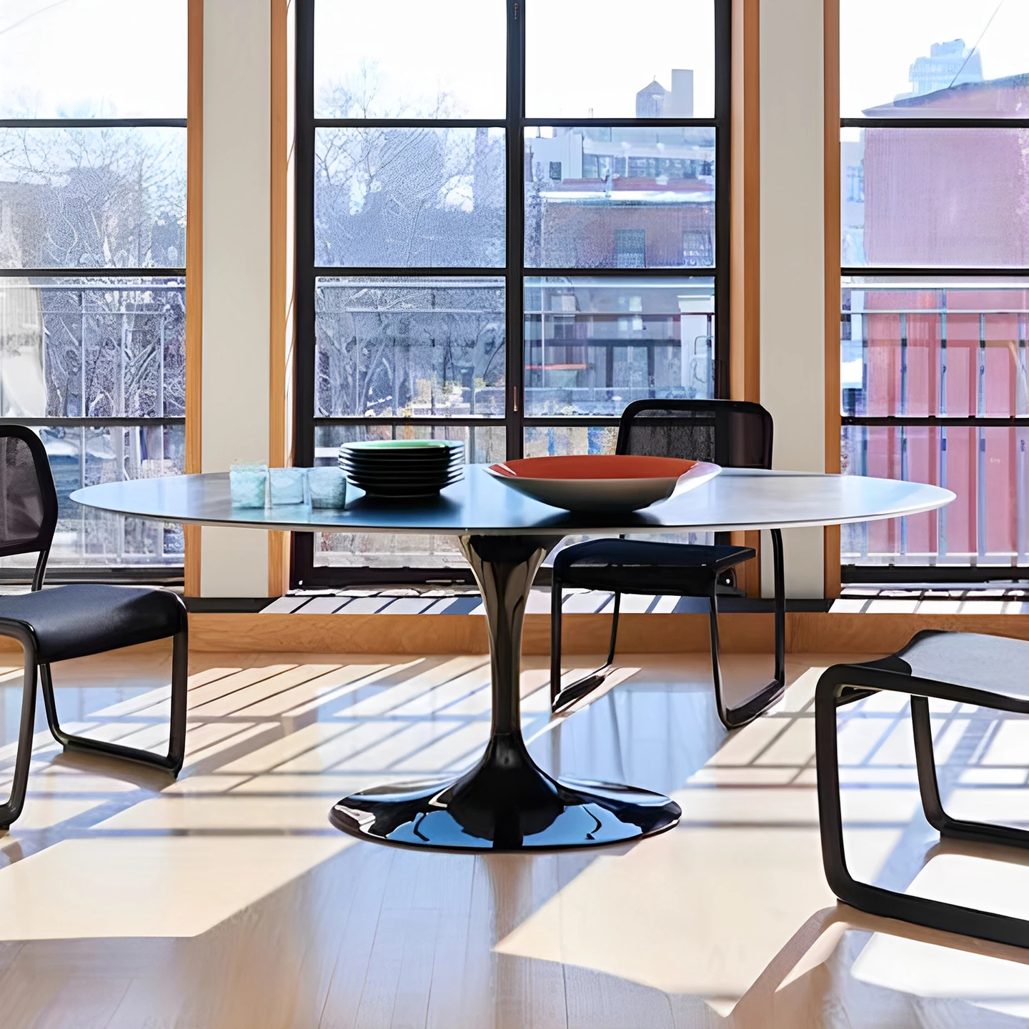 エレガントなチューリップ型天然大理石ダイニングテーブル - モダンでシンプルなイタリアンデザイン、ラグジュアリーな雰囲気を演出するオーバルテーブル。高級感あふれるヴィラにぴったり!