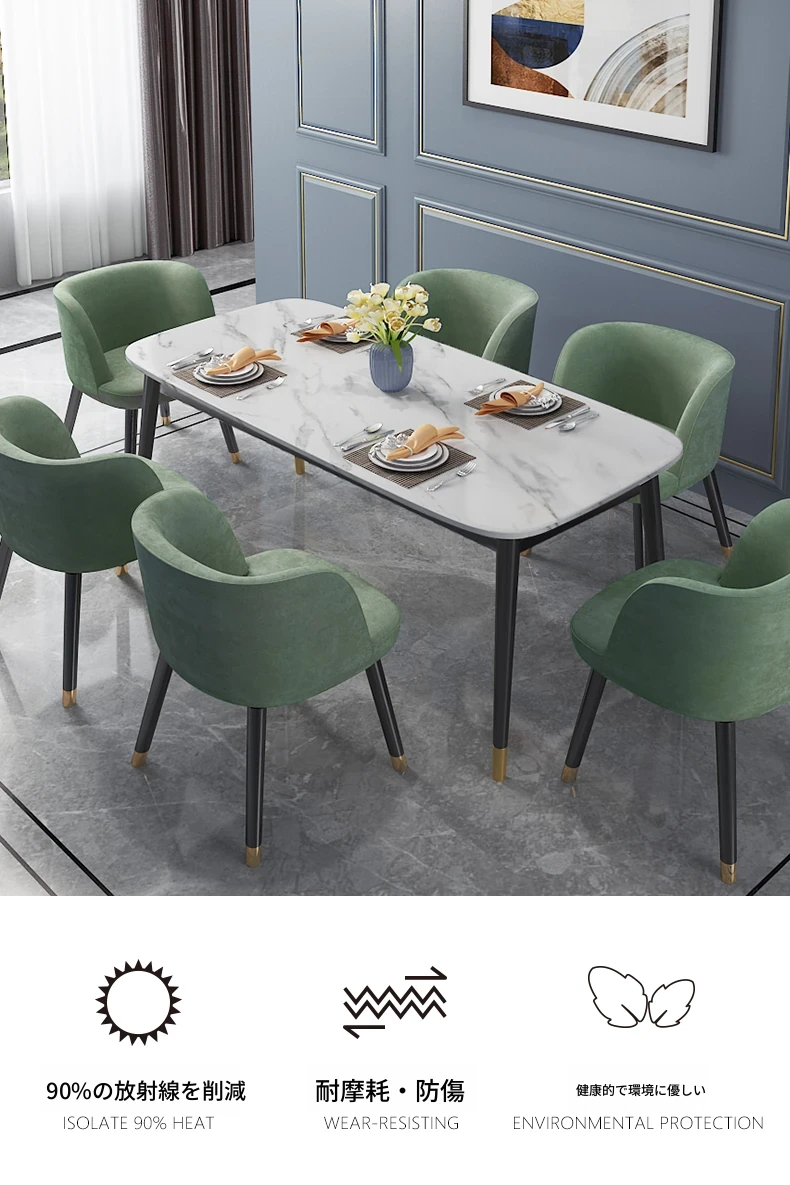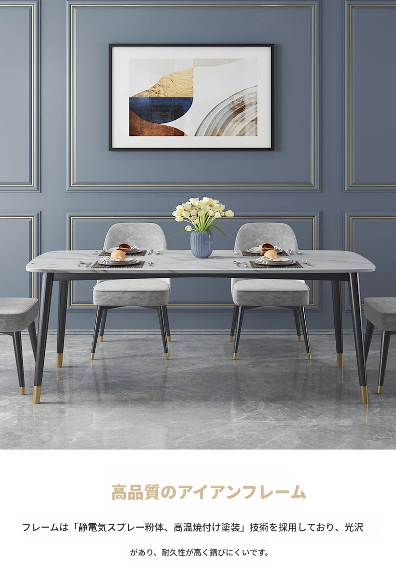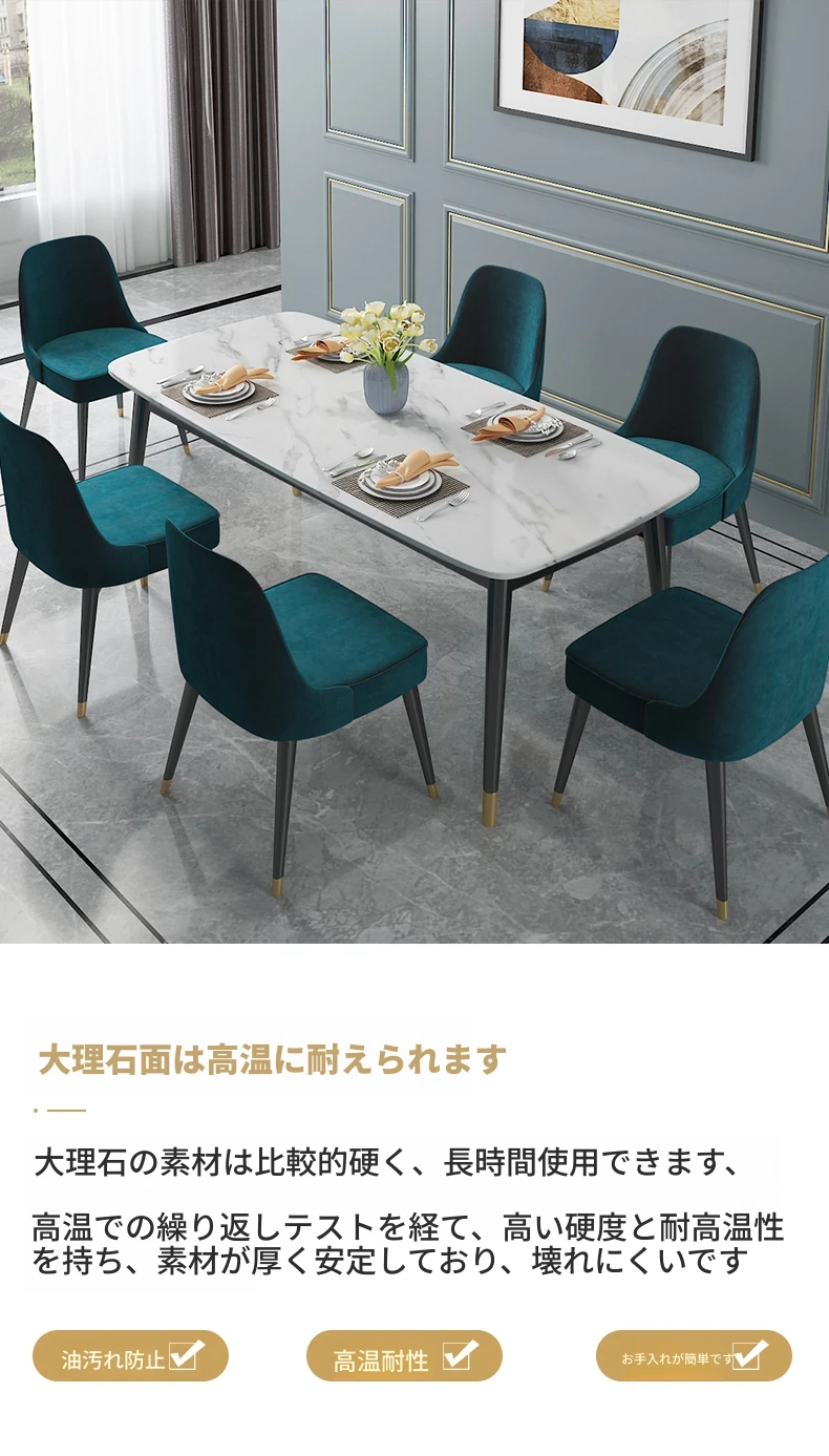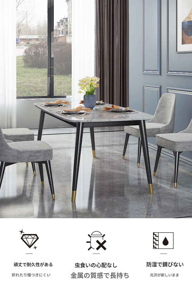 現代的なミニマリストデザインの長方形ダイニングテーブルと椅子のセット - 大理石風の軽やかな高級感で、小さな住まいにもぴったり!食事をもっと特別にするアイテム。