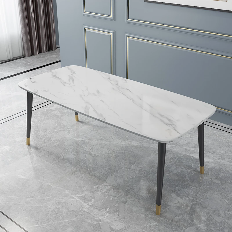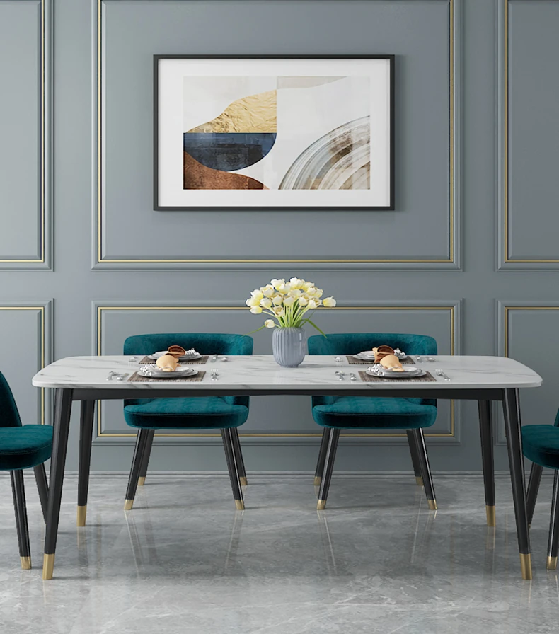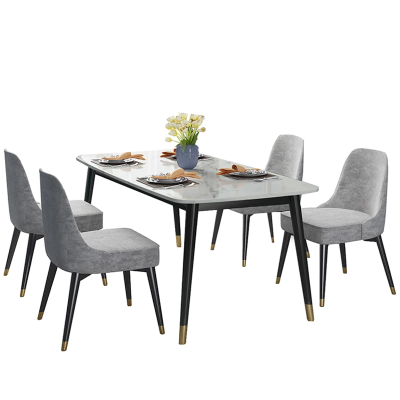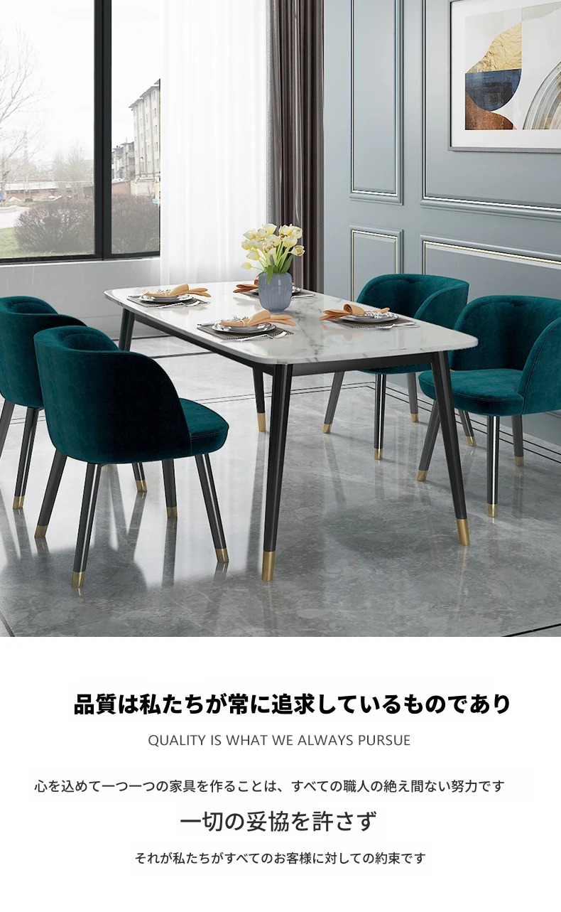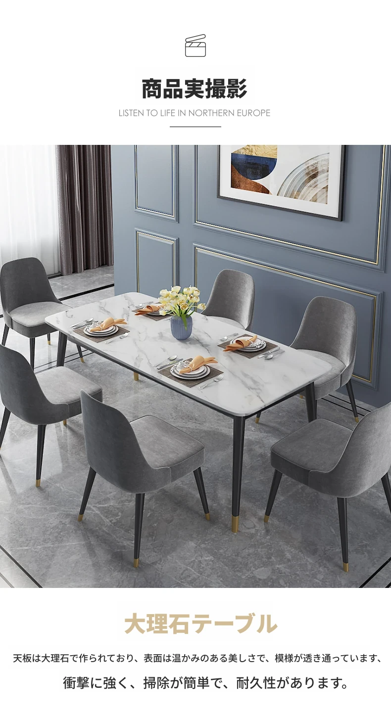 現代的なミニマリストデザインの長方形ダイニングテーブルと椅子のセット - 大理石風の軽やかな高級感で、小さな住まいにもぴったり!食事をもっと特別にするアイテム。