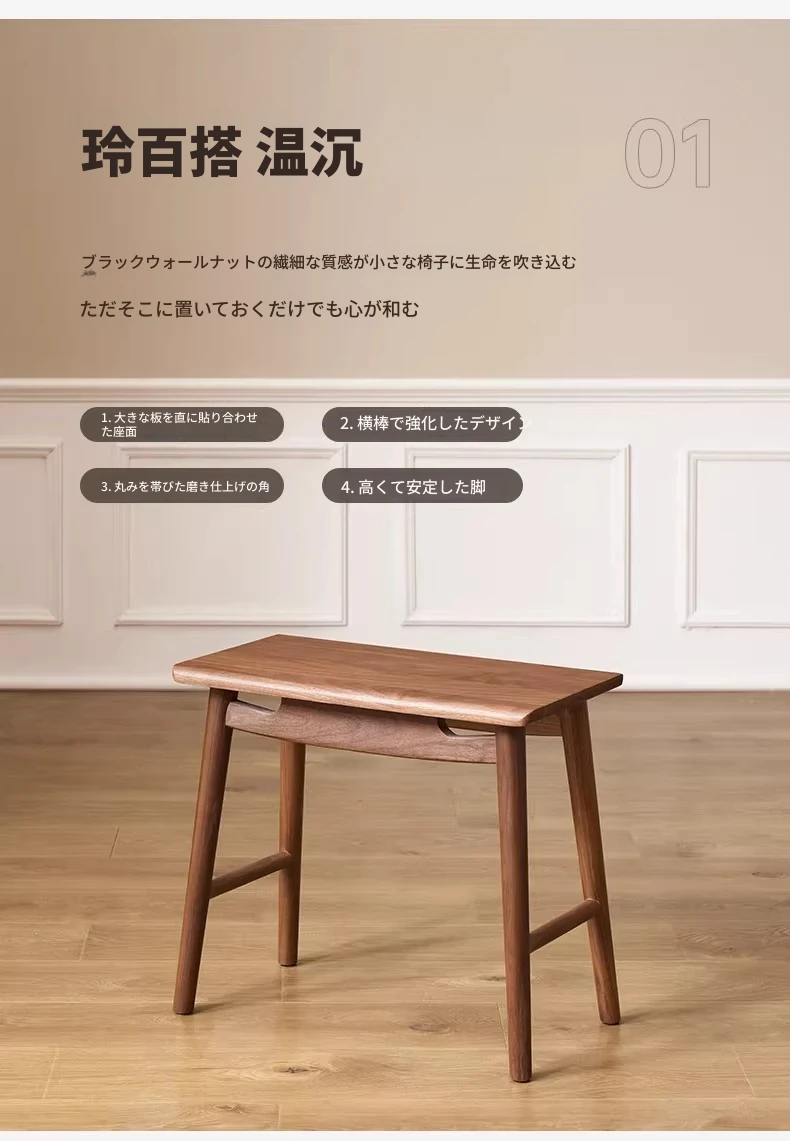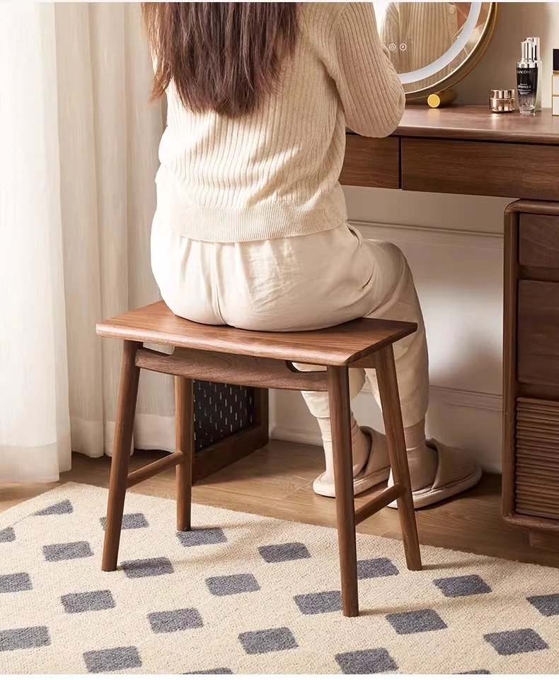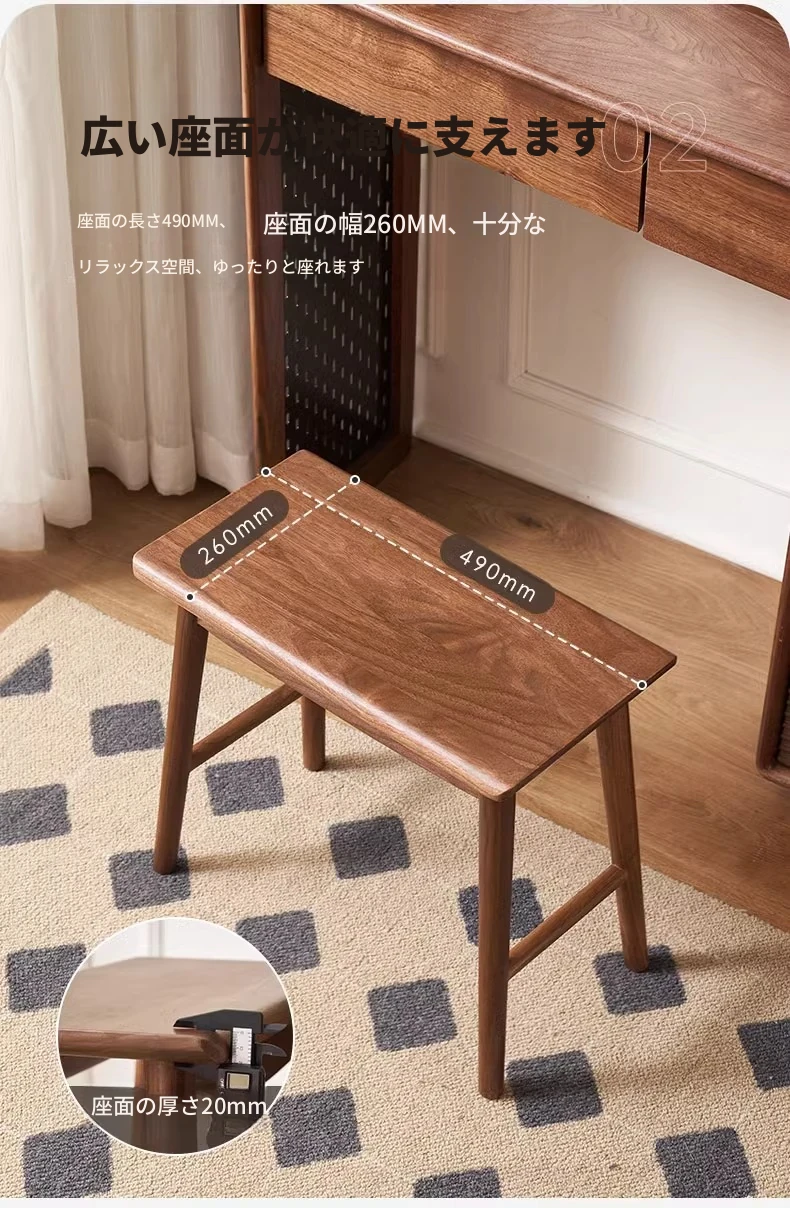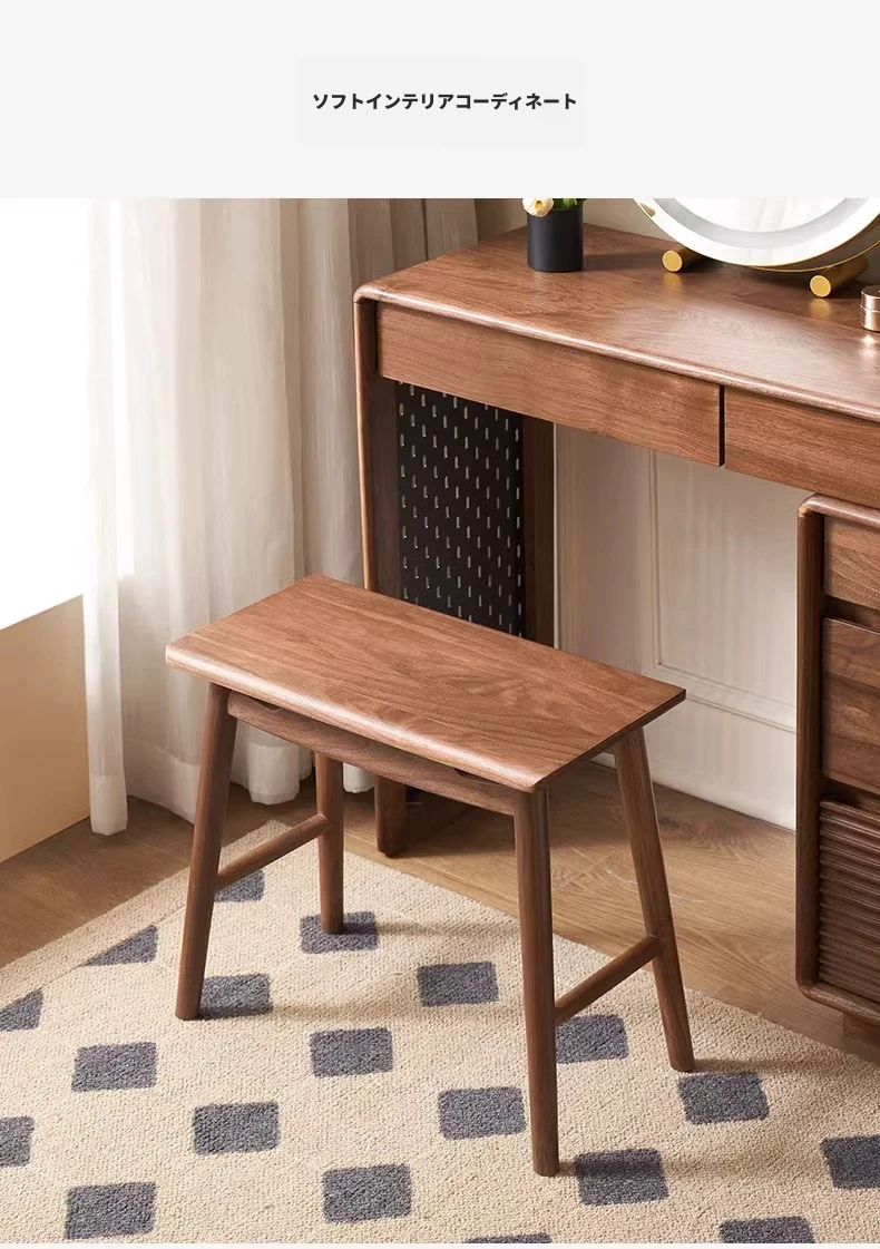 北欧スタイル全木製ドレッシングスツール|モダンでラグジュアリーなウォールナットウッド製|コンパクトな寝室にぴったりの馬鞍型スツール|美しさと機能性を兼ね備えたアイテムです!