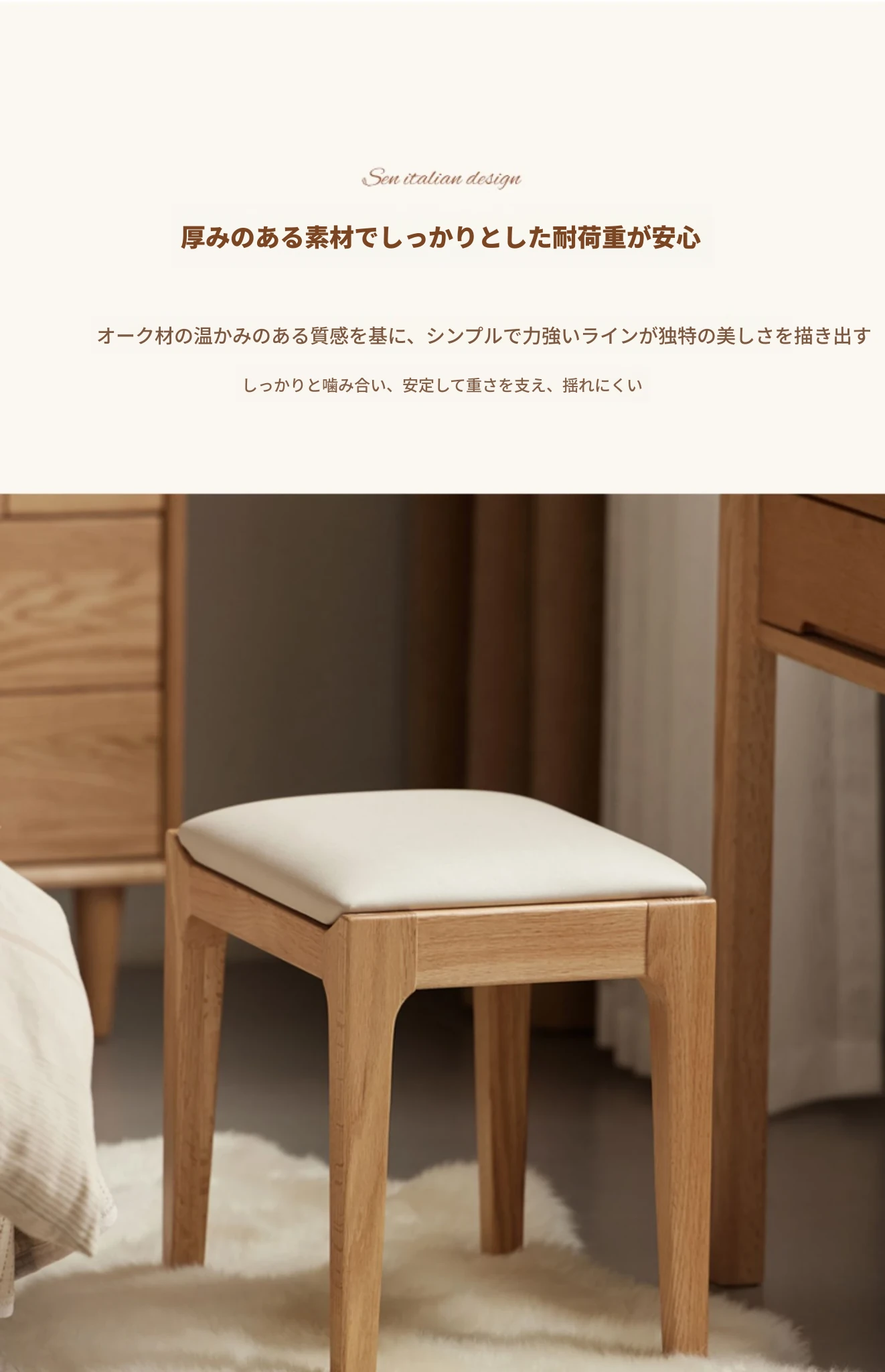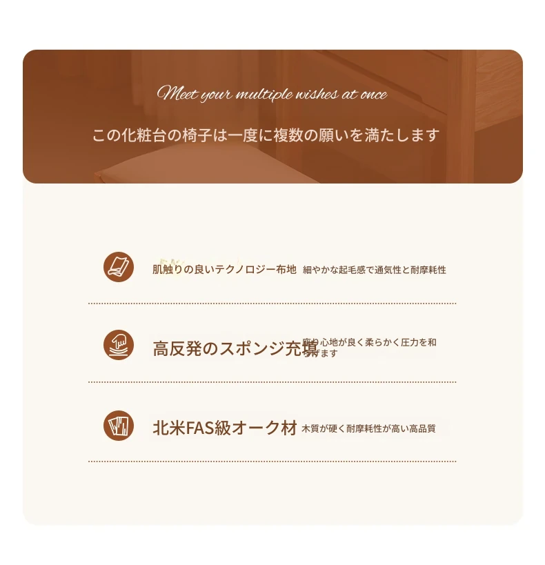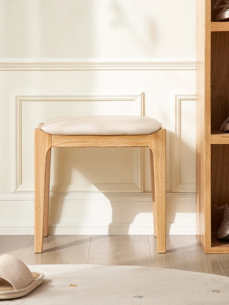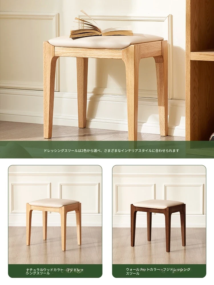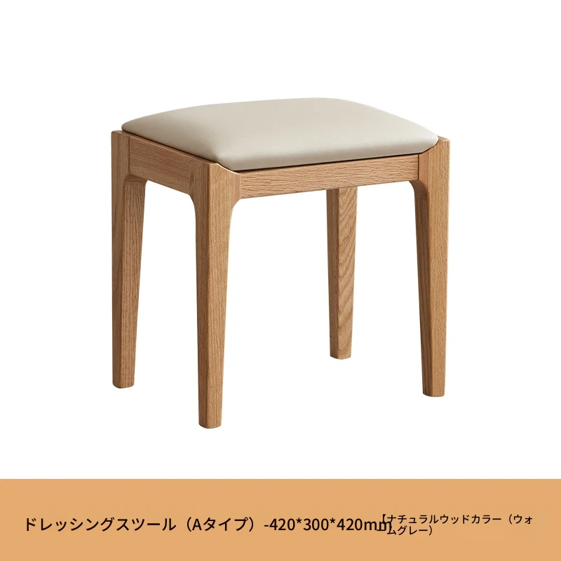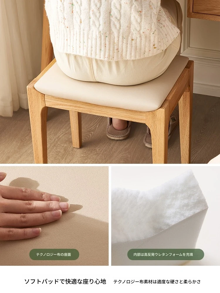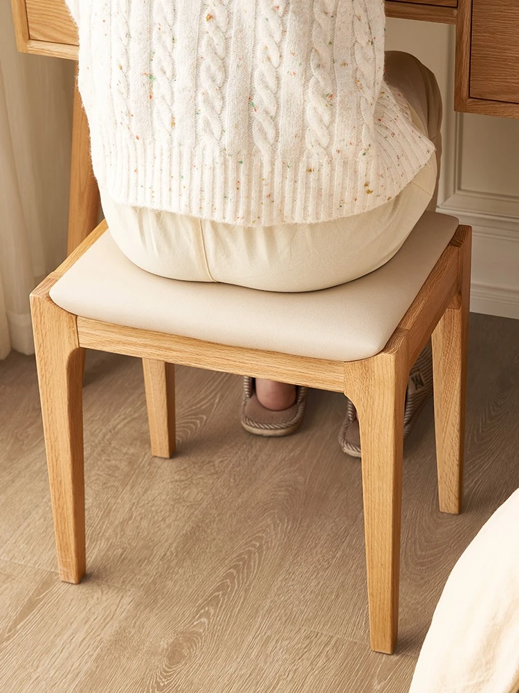 北欧スタイルの無垢材ドレッシングスツール - モダンでシンプル、寝室にぴったりのオーク製ソフトパッキングスツール。小型スペースにも最適な和風の木製メイクアップスツールで、洗練された雰囲気を演出します。