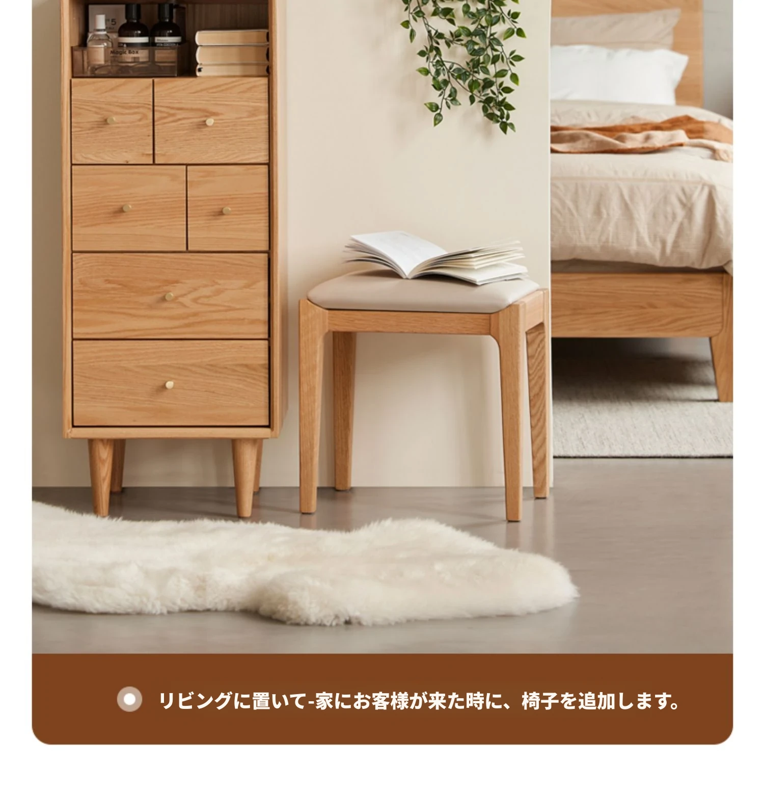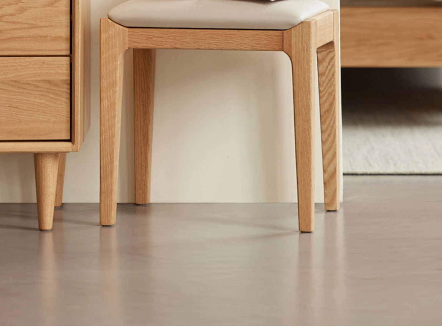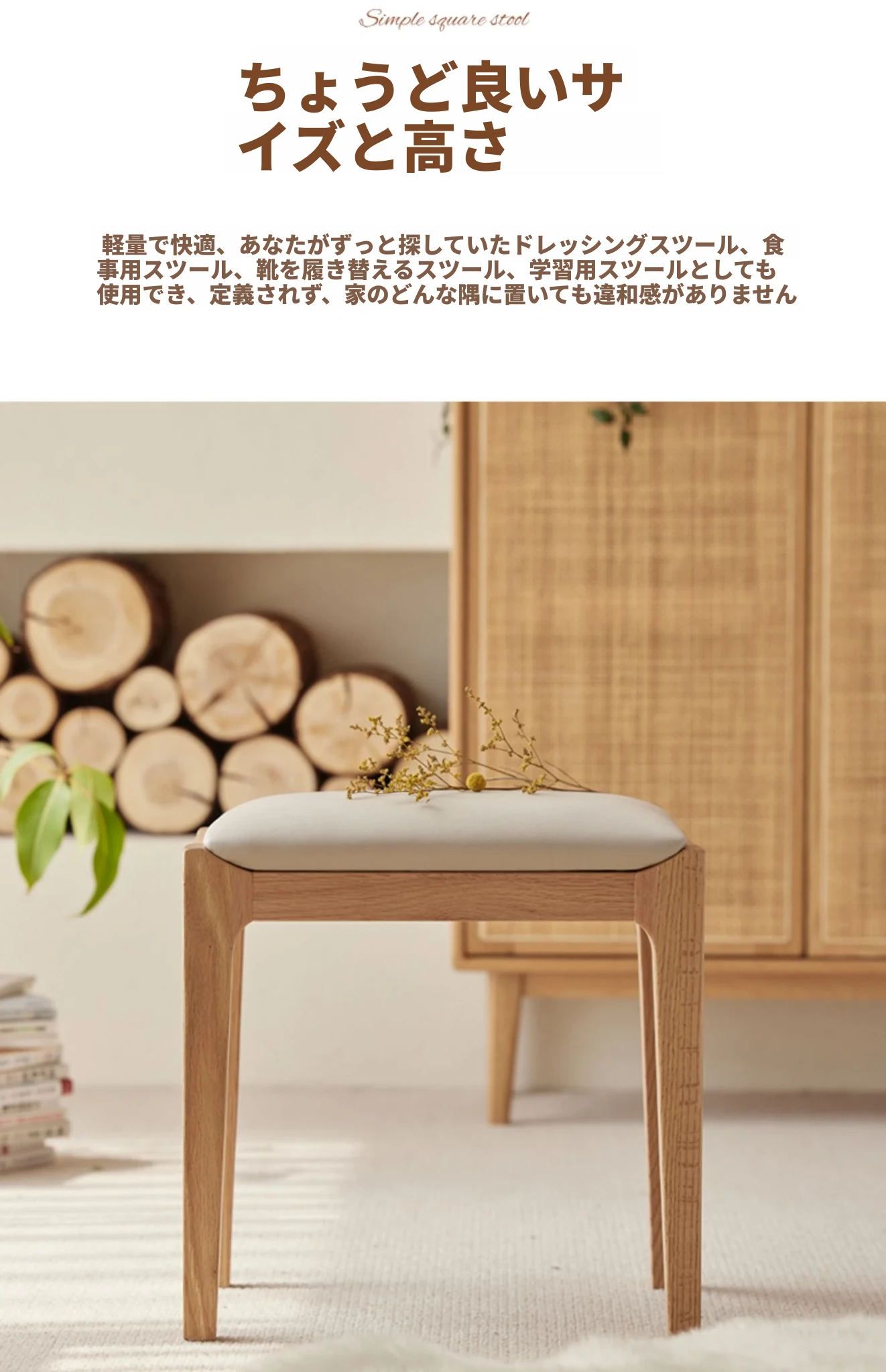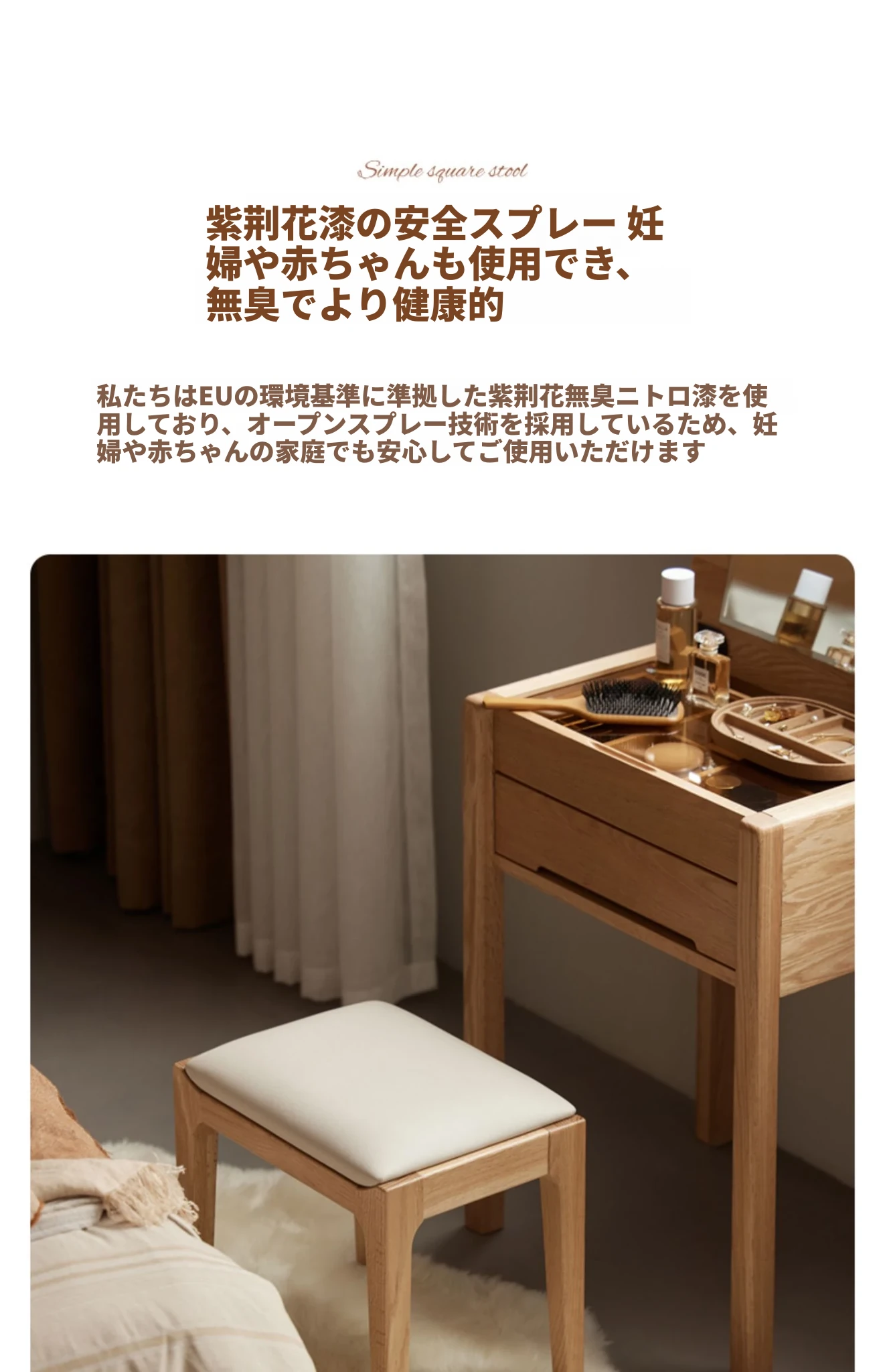 北欧スタイルの無垢材ドレッシングスツール - モダンでシンプル、寝室にぴったりのオーク製ソフトパッキングスツール。小型スペースにも最適な和風の木製メイクアップスツールで、洗練された雰囲気を演出します。
