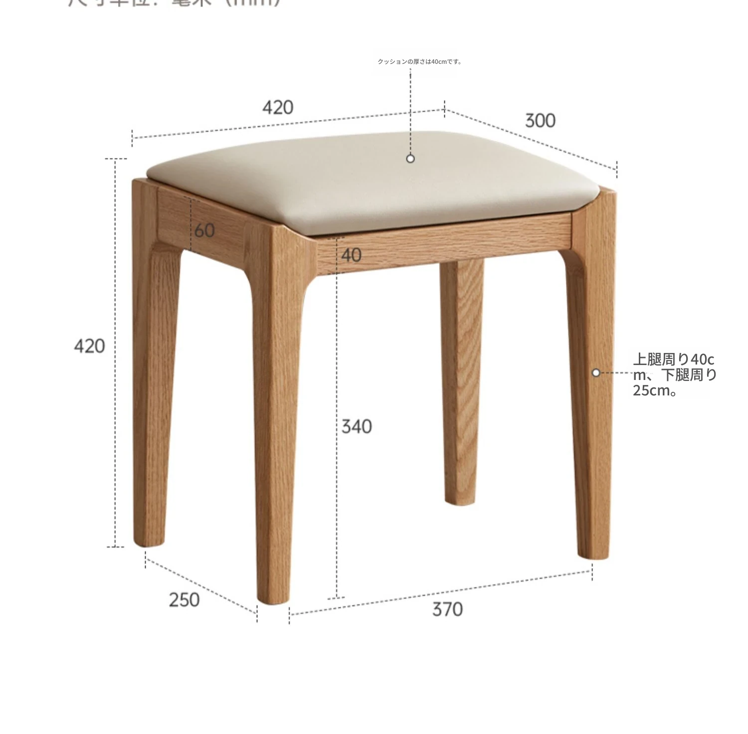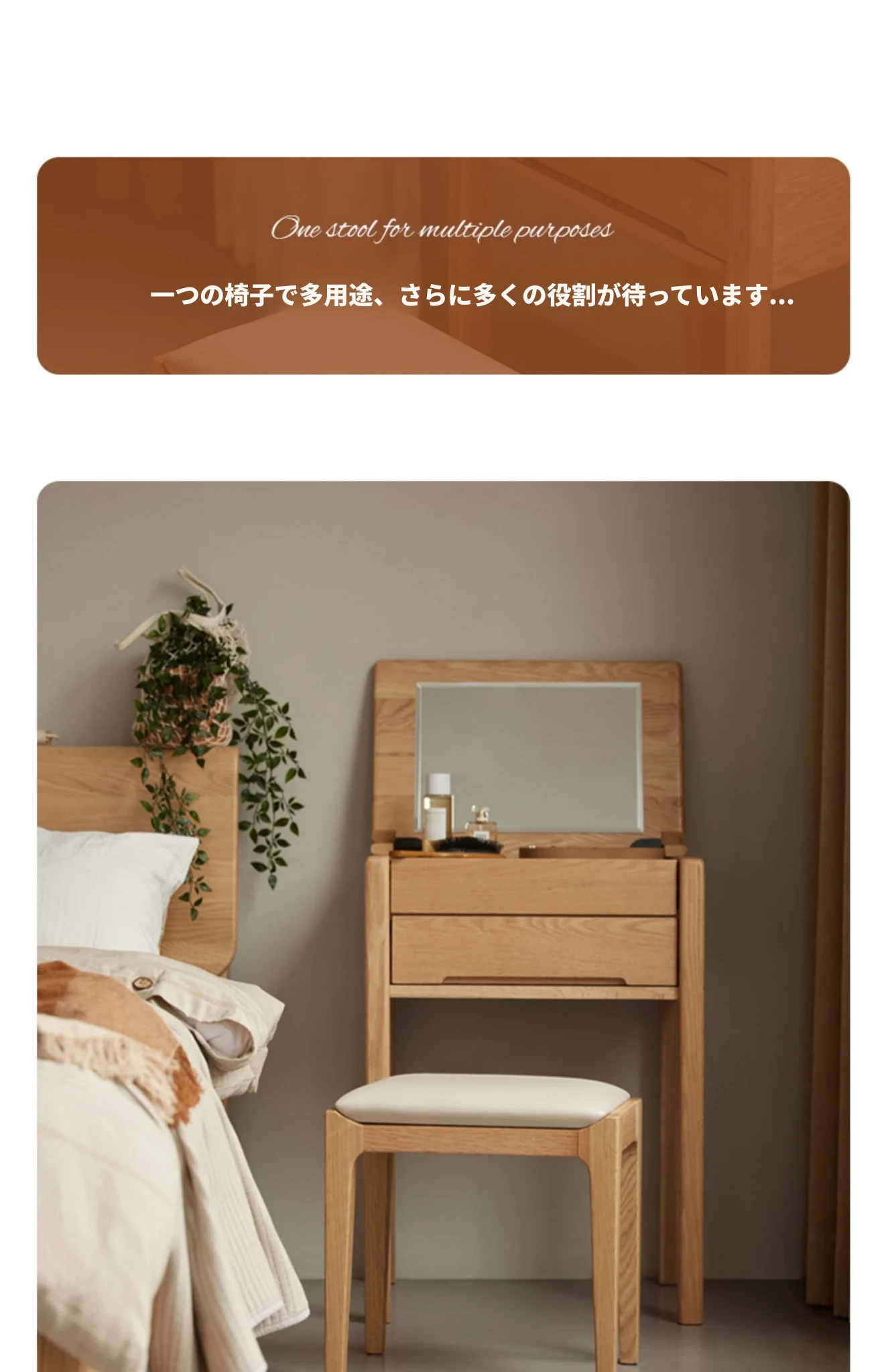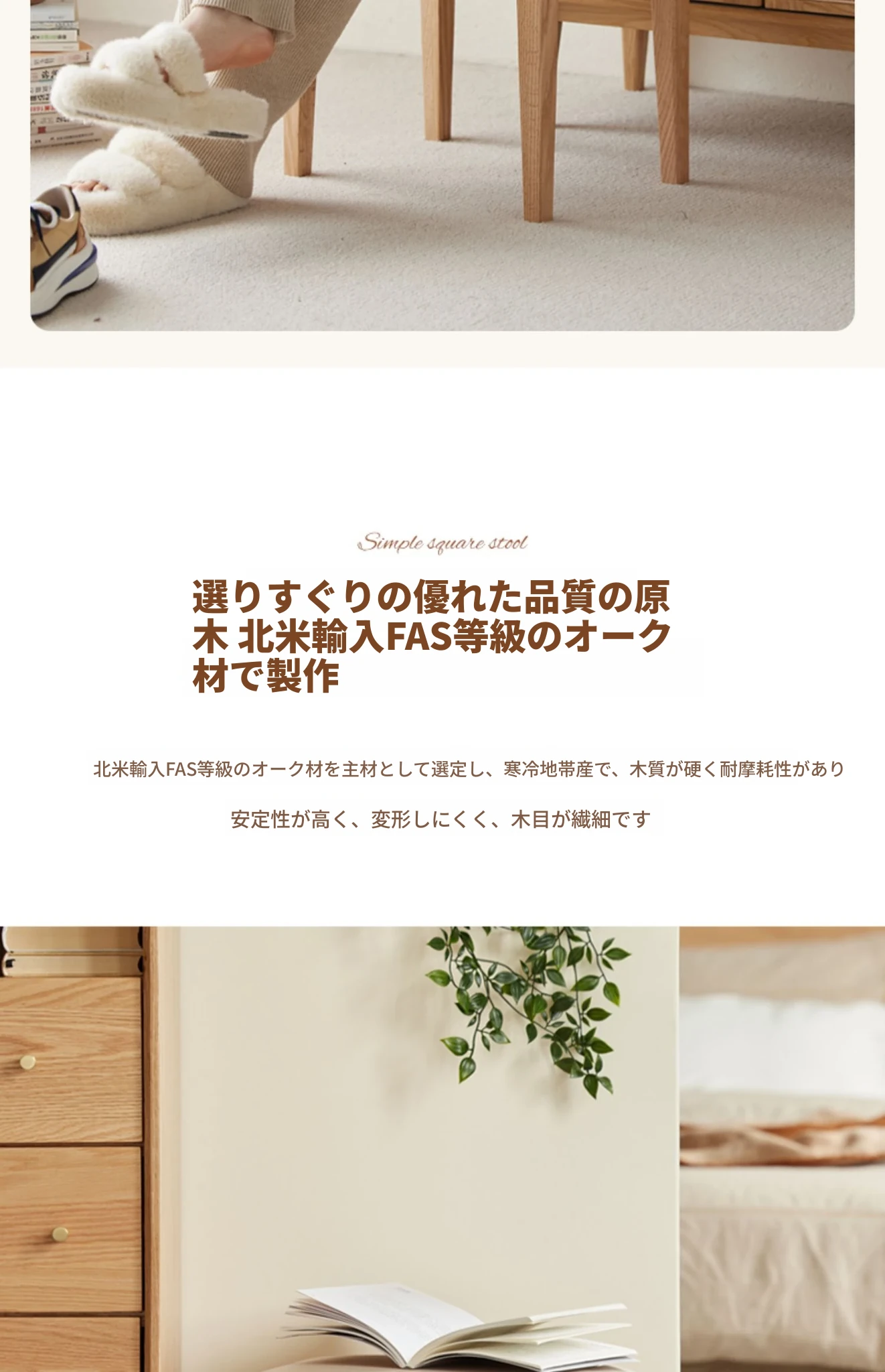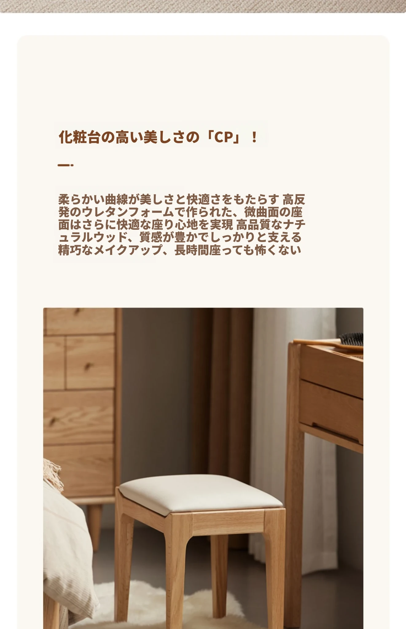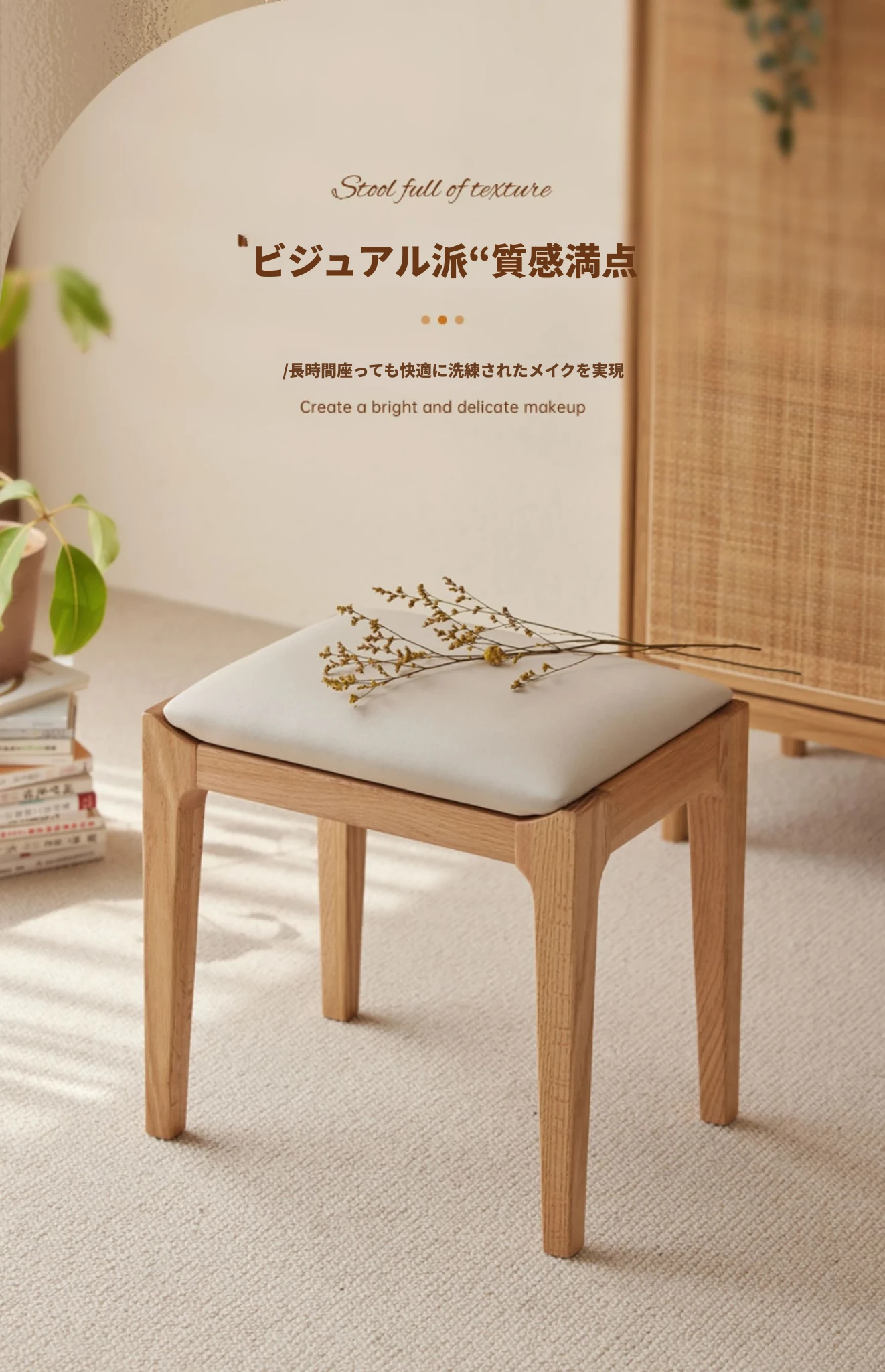 北欧スタイルの無垢材ドレッシングスツール - モダンでシンプル、寝室にぴったりのオーク製ソフトパッキングスツール。小型スペースにも最適な和風の木製メイクアップスツールで、洗練された雰囲気を演出します。