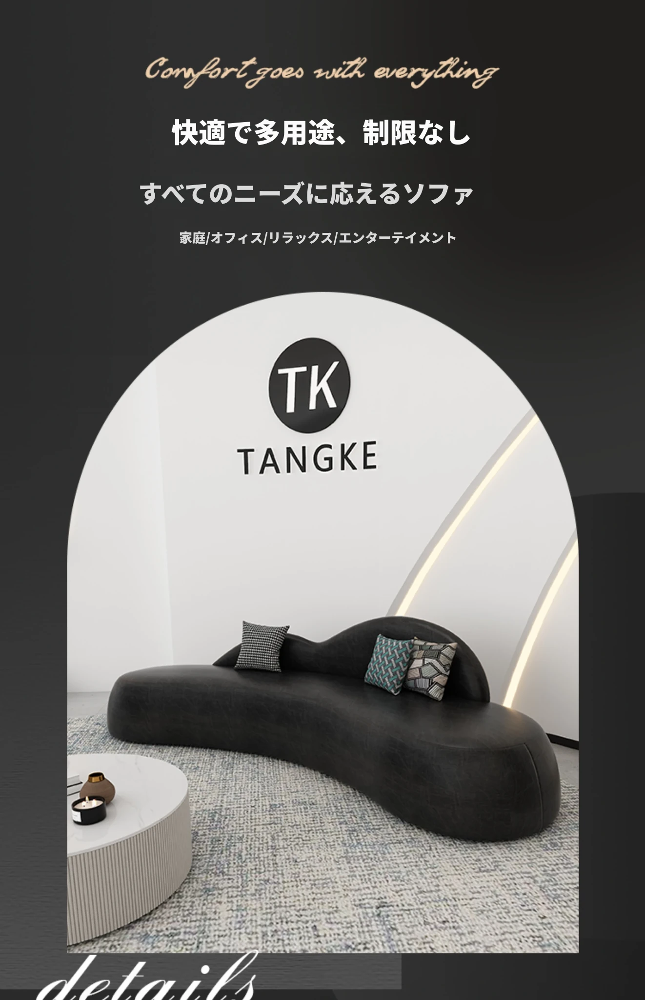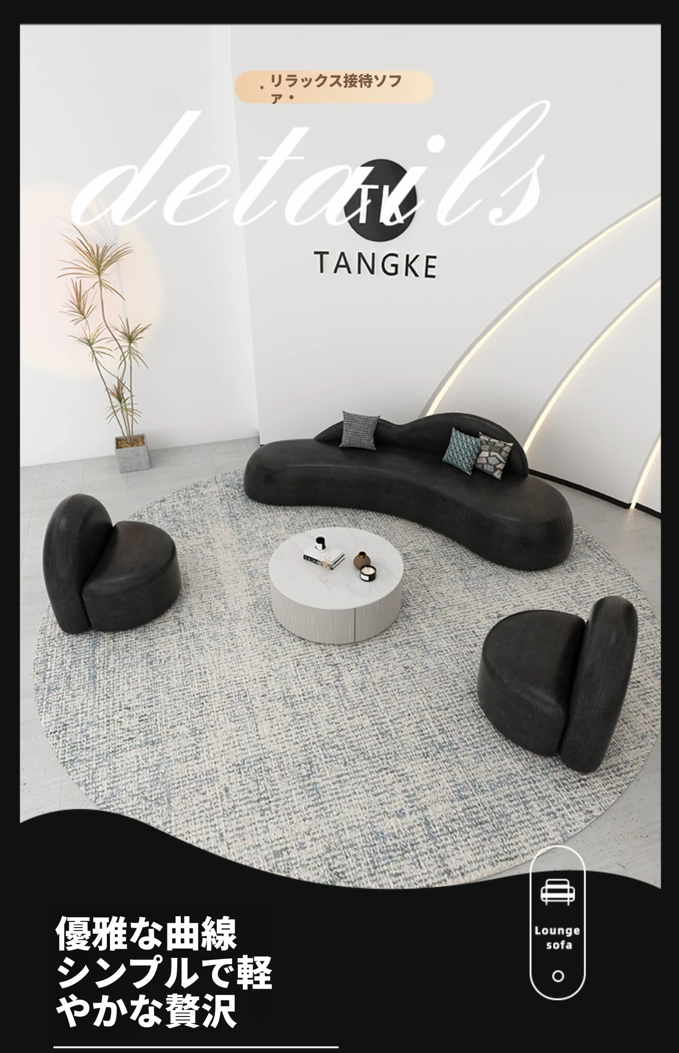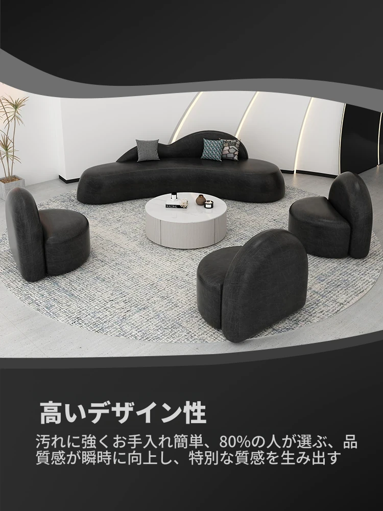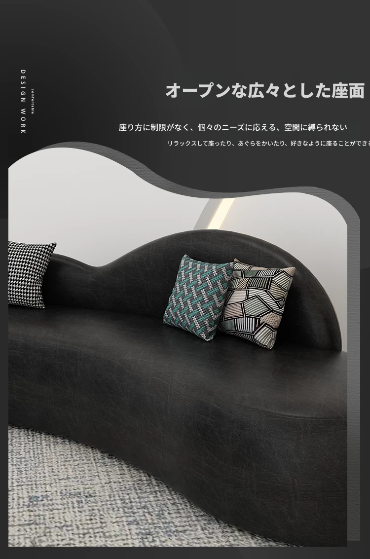 新作!おしゃれな異形ソファ - 合皮素材で小型リビングやモデルルーム、美容院の待合スペースにも最適!快適な3人掛けで、リラックスしたひとときを提供します。お部屋をスタイリッシュに彩る一品です!
