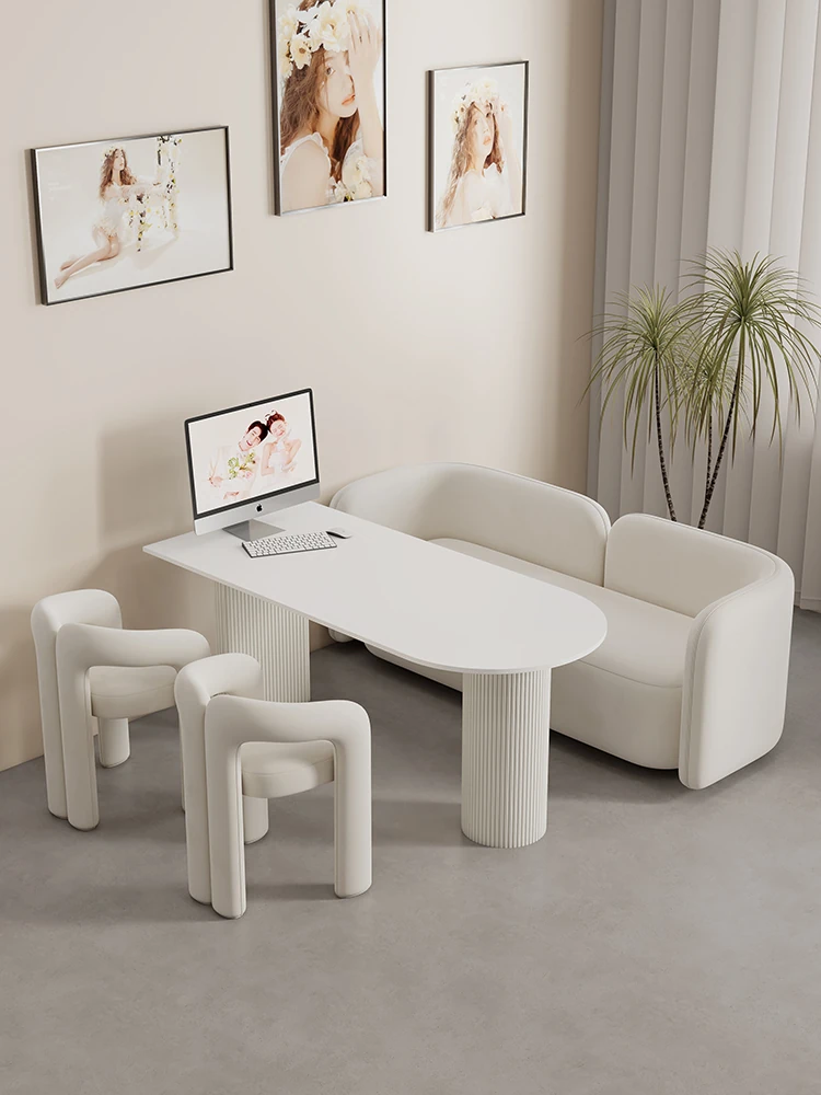 クリーム風のウェディングドレス店専用ソファー!おしゃれな撮影スポット、選びやすいデザインの接客テーブルセット。美容院の待合スペースにも最適!トレンディなテクノロジー布使用で、インスタ映え間違いなし!