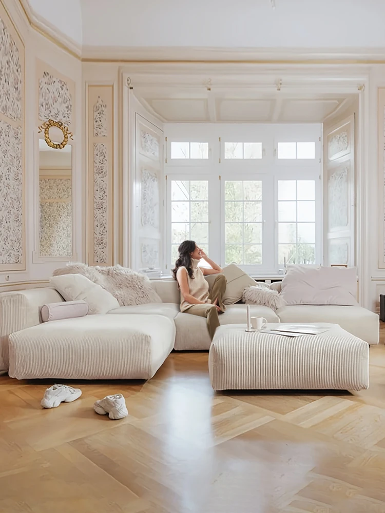 北欧風コーデュロイソファ 新作!侘寂スタイルの布張りソファ ダブル・スリーピース クリーム風の小型豆腐ブロックソファで、コンパクトなリビングに最適!心地よい居心地をお届けします。
