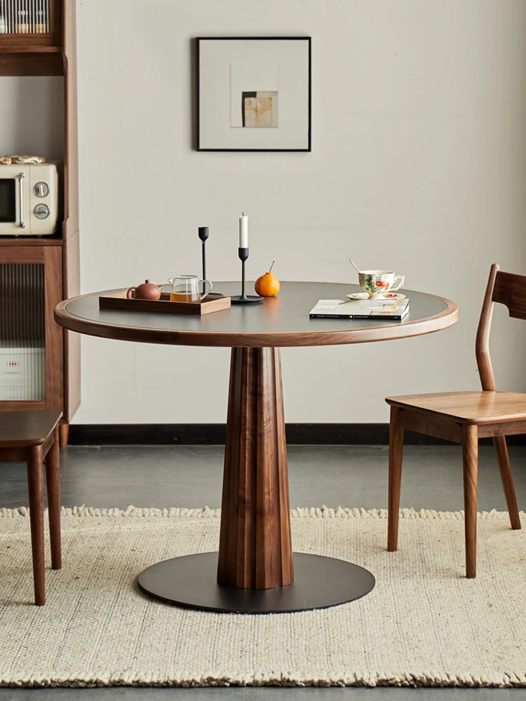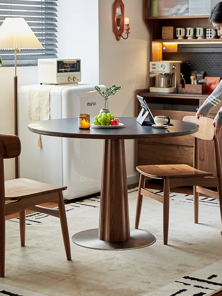ウォールナット無垢材のラウンドテーブル - 防水・耐磨・傷防止で小型アパートに最適!スタイリッシュなデザインのダイニングテーブルで、食事のひとときをもっと特別に。
