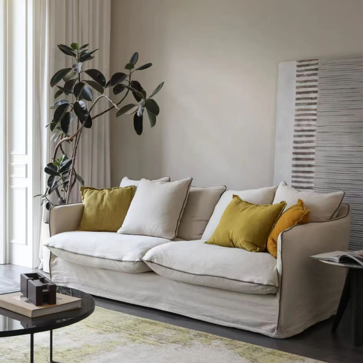 侘寂風の雲朵ソファ - レトロなリネン素材、洗える三人掛けデザイン!小さなリビングにもぴったりなクリーミーなスタイルで、居心地の良い空間を演出します。