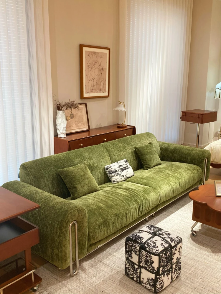2025年新作!フレンチヴィンテージグリーンシェニールソファー - 小型リビングにぴったりの直線デザイン、洗練された布地で心地よいひとときを演出。おしゃれで機能的な空間を手に入れましょう!