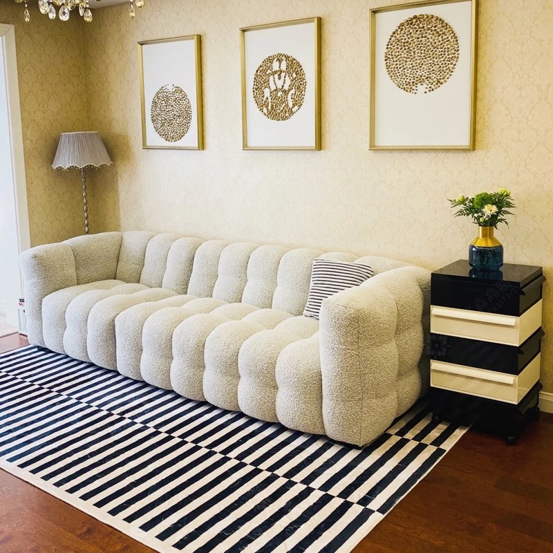 侘寂風のクリームトーン三人掛けソファ|ミニマルなラムファー素材で、レトロなボバやマシュマロのような柔らかさを実現!北欧デザインで、リビングにぴったりのスタイリッシュなアイテムです。
