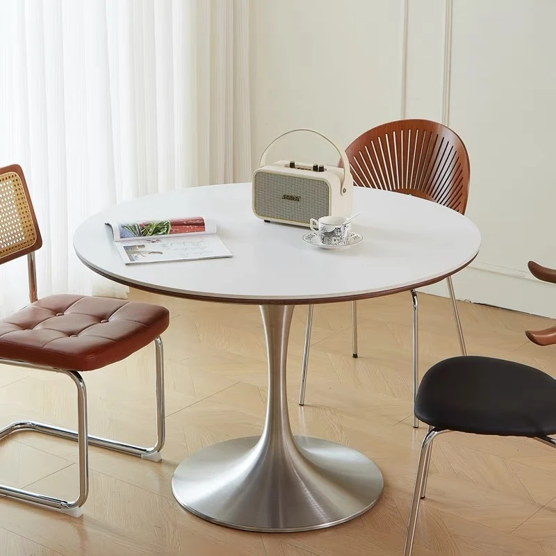 全托岩板のフレンチスタイル中古ダイニングテーブル - ステンレス製チューリップ型の円形テーブル、小さなスペースにも最適!おしゃれで機能的なデザインで、家庭の食事シーンを華やかに演出します。