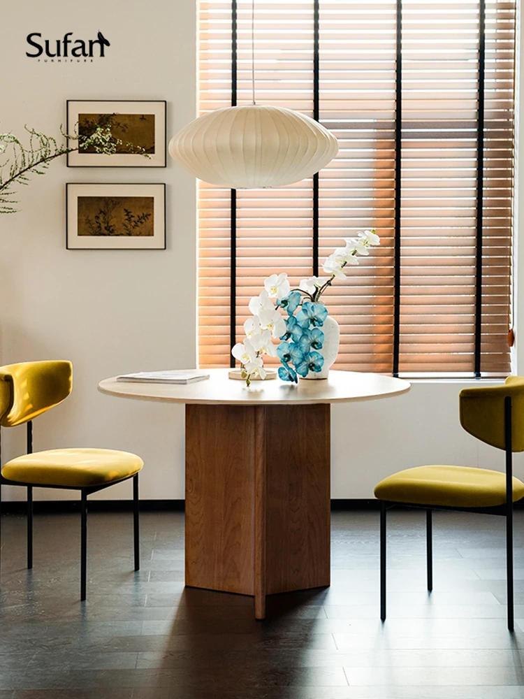 ヴィンテージ風の無垢材ラウンドダイニングテーブル&チェアセット、ウォールナット色の家庭用テーブル、フレンチスタイルのドウ石岩板ラウンドテーブルで、優雅な食事空間を演出!